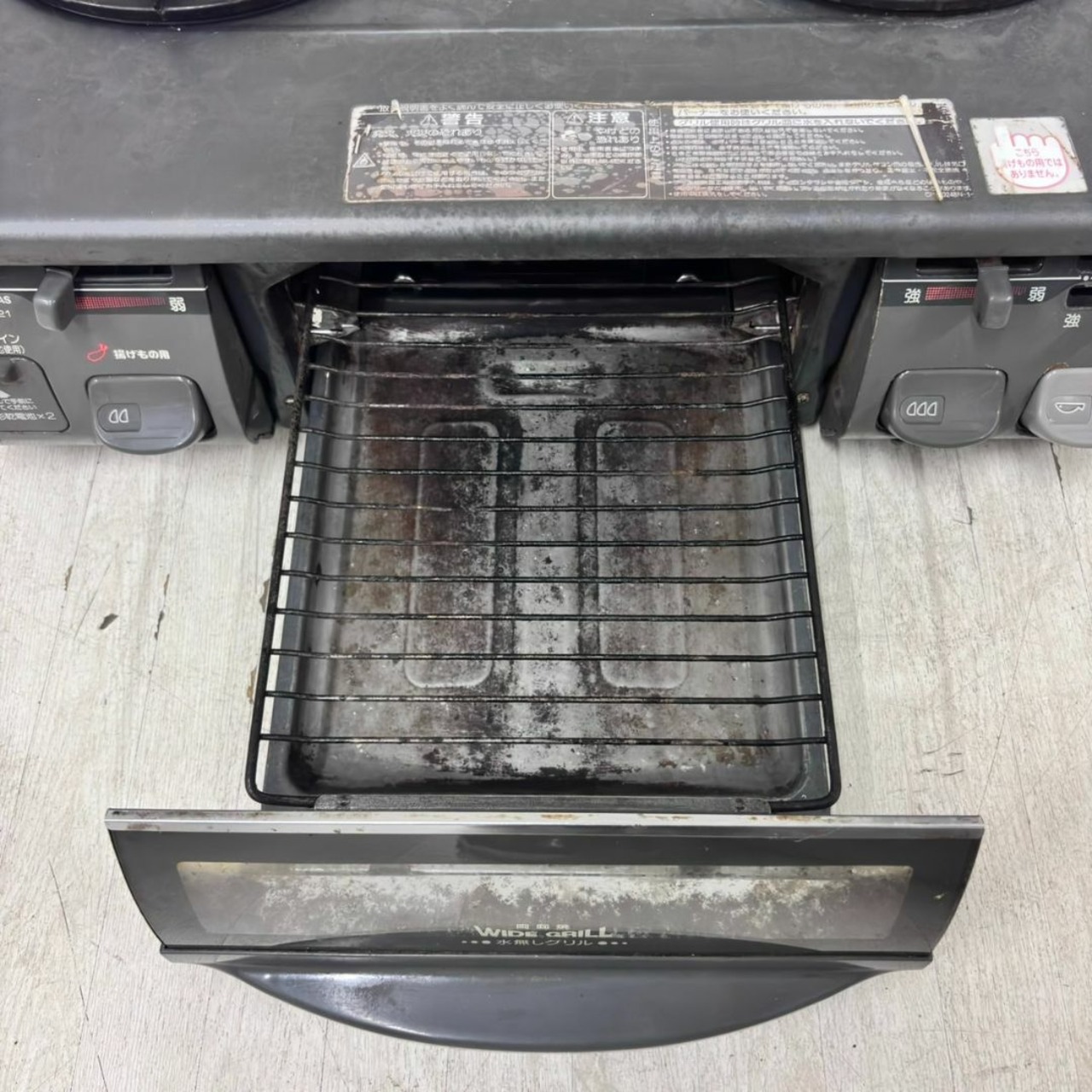 ※五徳、五徳周りかなり汚れあり 側面シールあり 排気口汚れかなりあり グリル中かなり汚れあり 操作スイッチ付近動作確認済 ホースなし