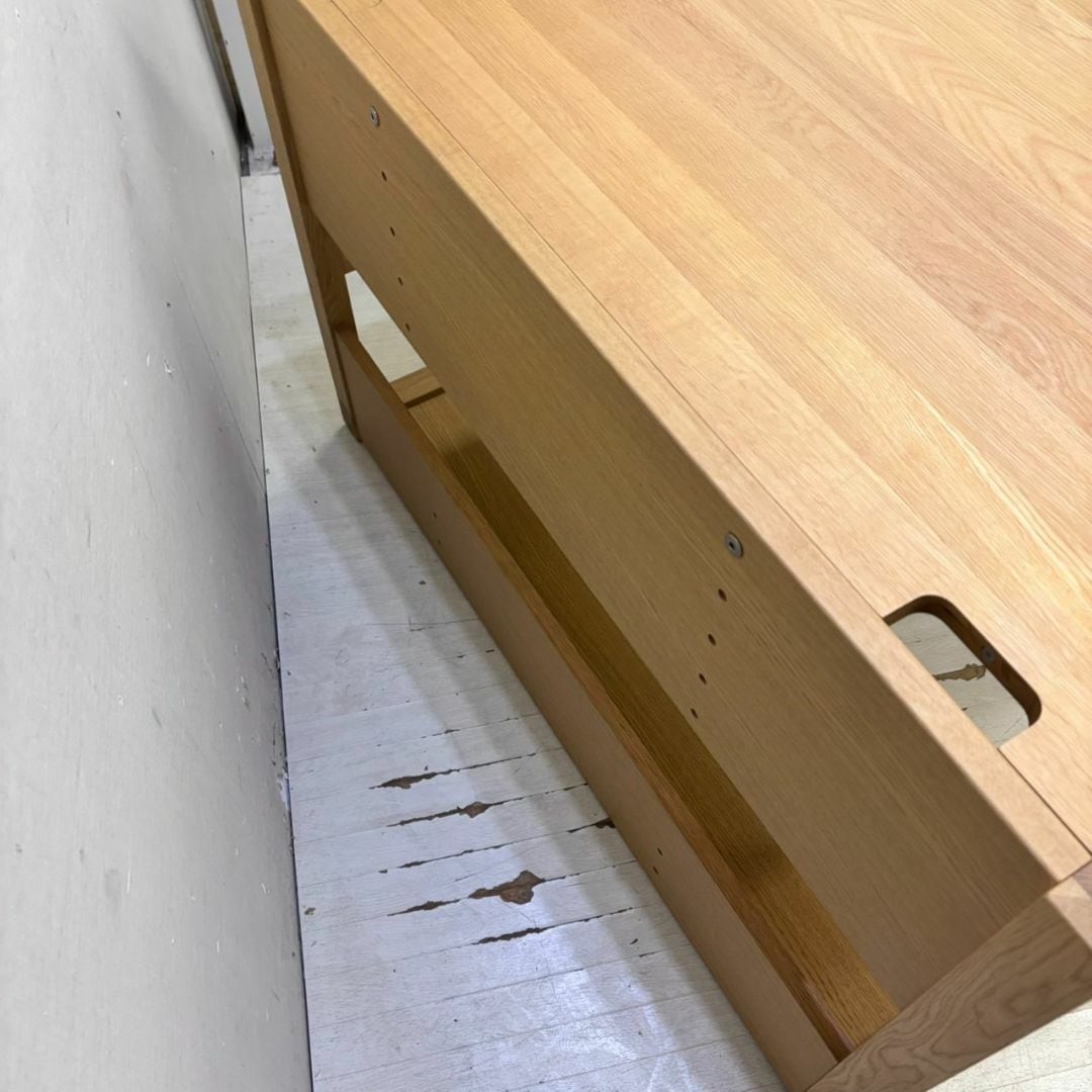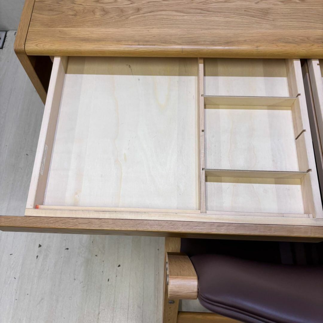 ※キズ・凹み:縁、角、引き出し、脚、チェア縁、天板 汚れ・シミ:引き出し、縁、天板、チェア縁、脚 その他:仕切り板、説明書、椅子カバーあり 椅子472*520*770座面高300、最大472*540*850座面高460