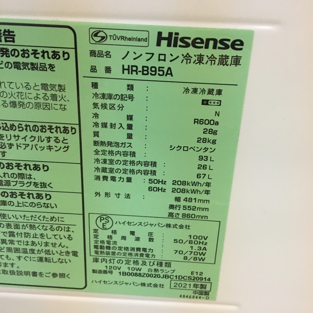 25097 一人暮らし2D冷蔵庫 Hisense HR-B95A 2021年製 93L