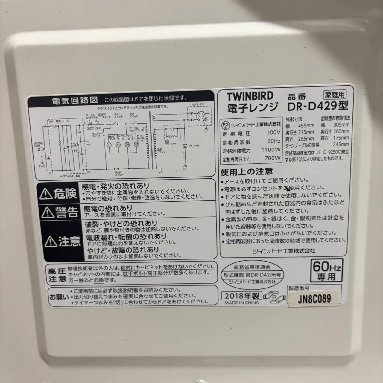 25271 ターンテーブル式電子レンジ TWINBIRD DR-D429 2018年製