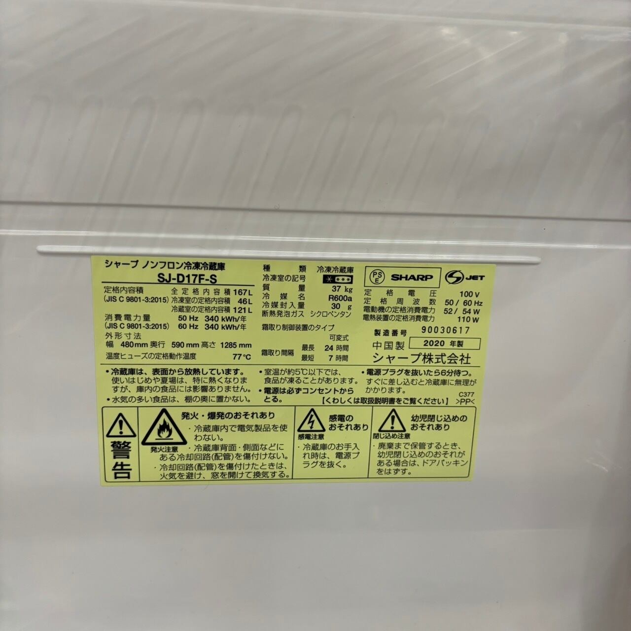 清掃待ち25277 一人暮らし2D冷蔵庫 SHARP SJ-D17F-S 2020年製 167L