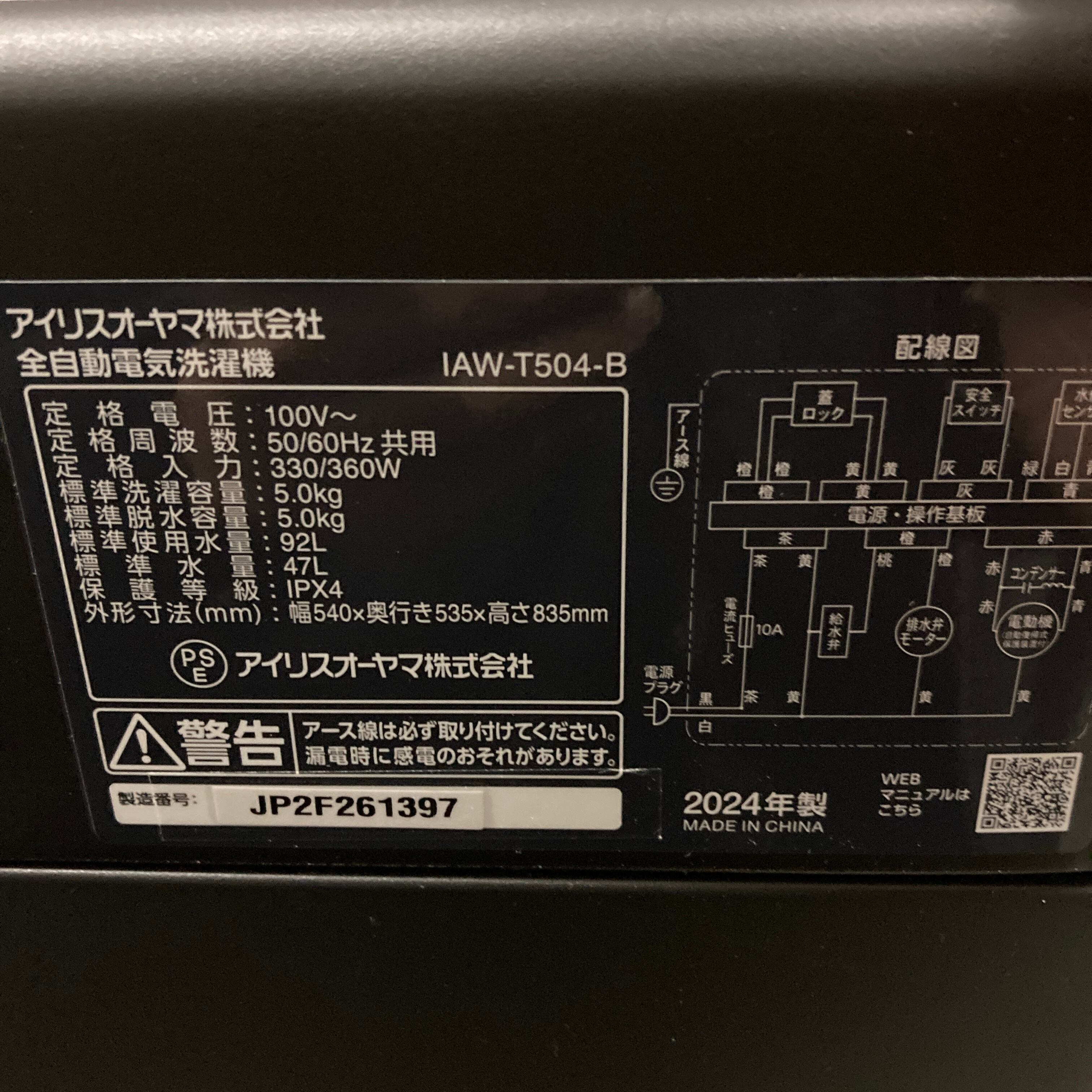 清掃待ち・H25378 一人暮らし縦型洗濯機 IRIS OHYAMA IAW-T504-B 2024年製 5.0kg