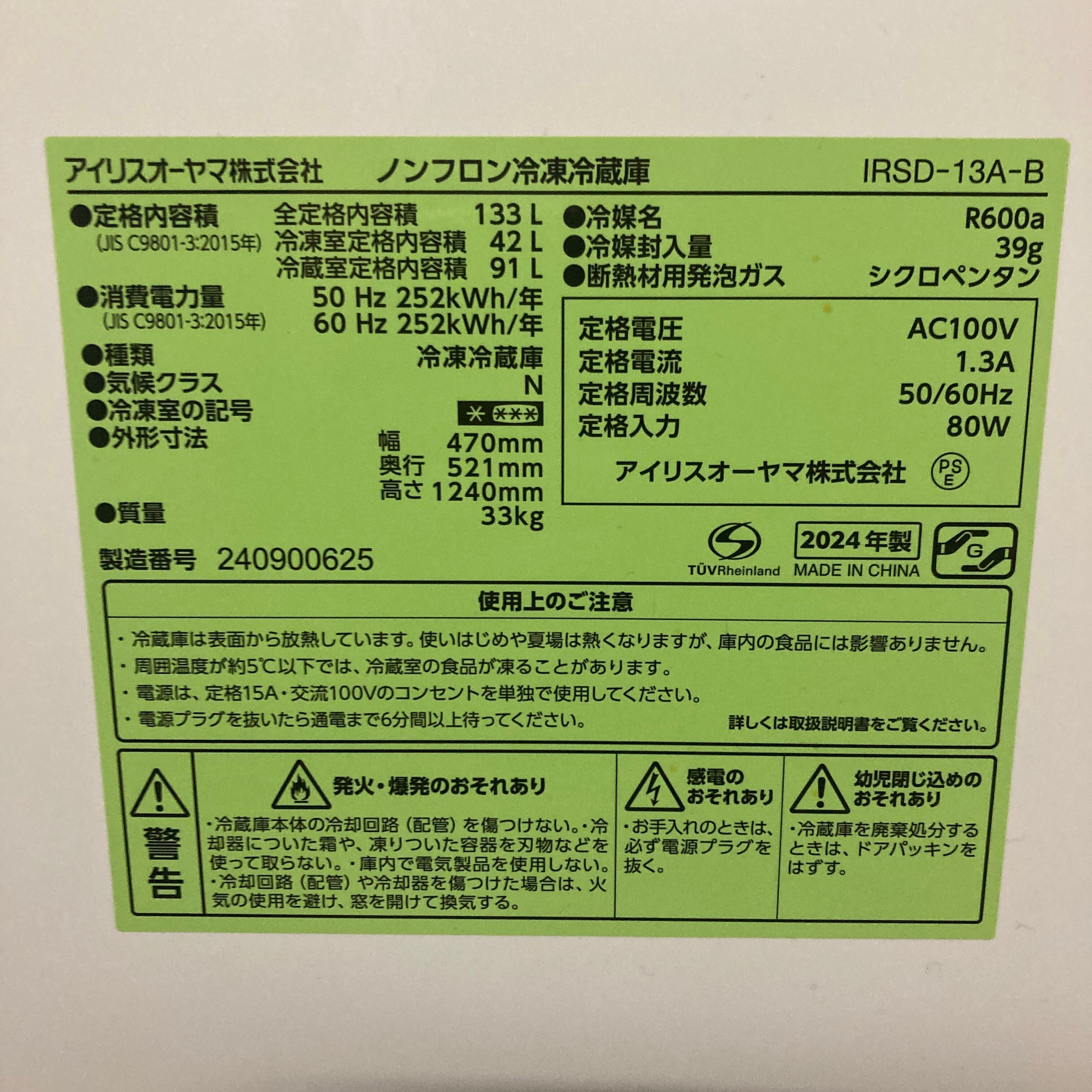 清掃待ち・25417 一人暮らし2D冷蔵庫 IRIS OHYAMA IRSD-13A-B 2024年製 133L