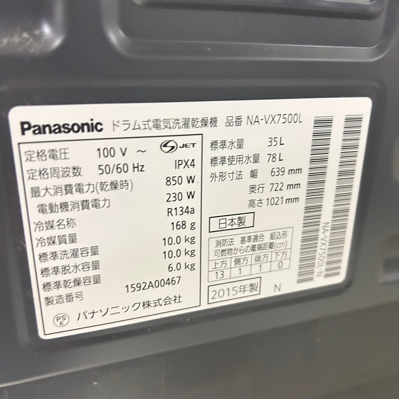 清掃待ち・25415 大容量ドラム式洗濯機 Panasonic NA-VX7500L 2015年 10kg/6kg