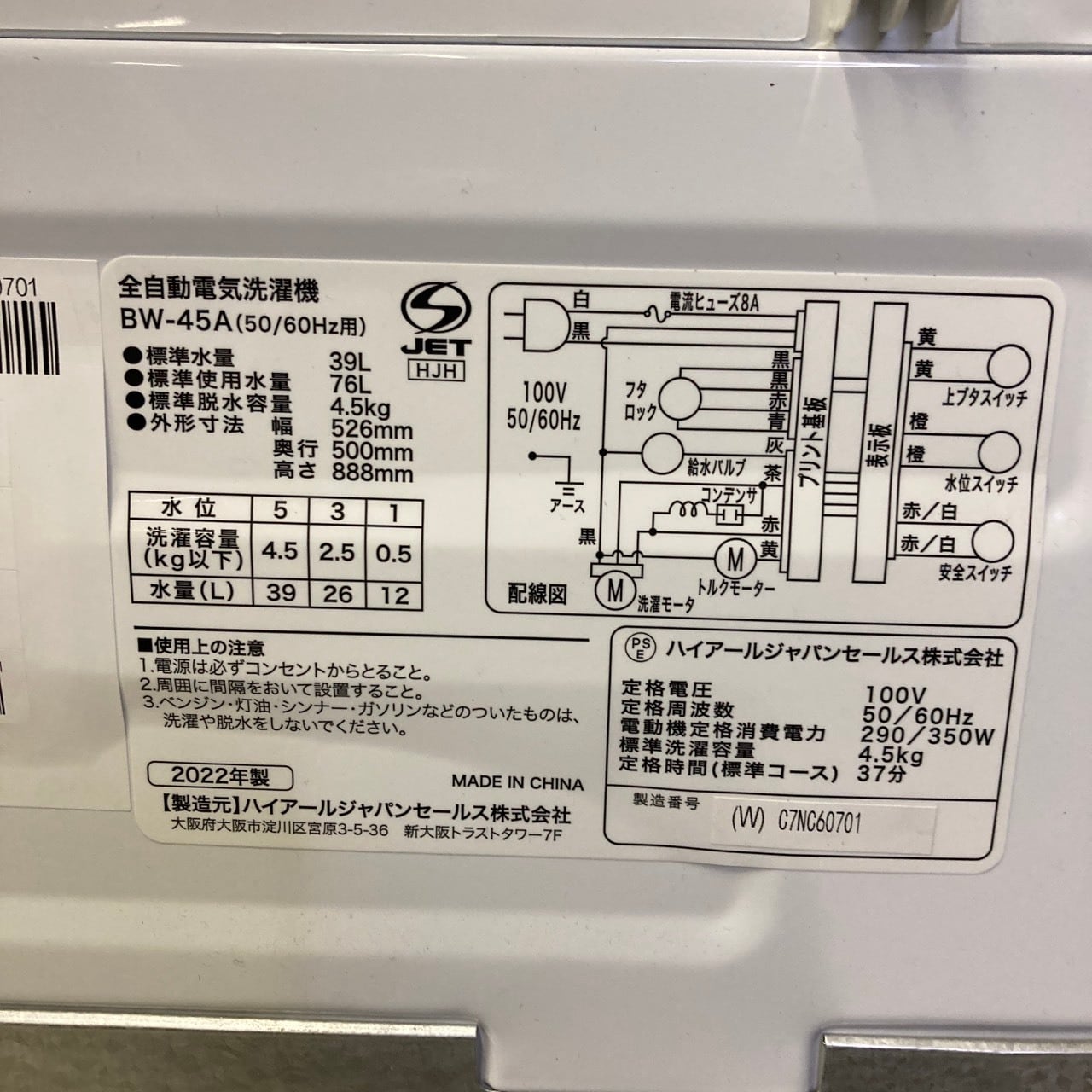 H25472 一人暮らし洗濯機 Haier BW-45A 2022年製 4.5kg