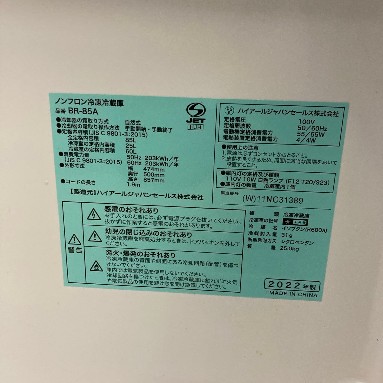 H25476 一人暮らし2D冷蔵庫 Haier BR-85A 2022年製 85L