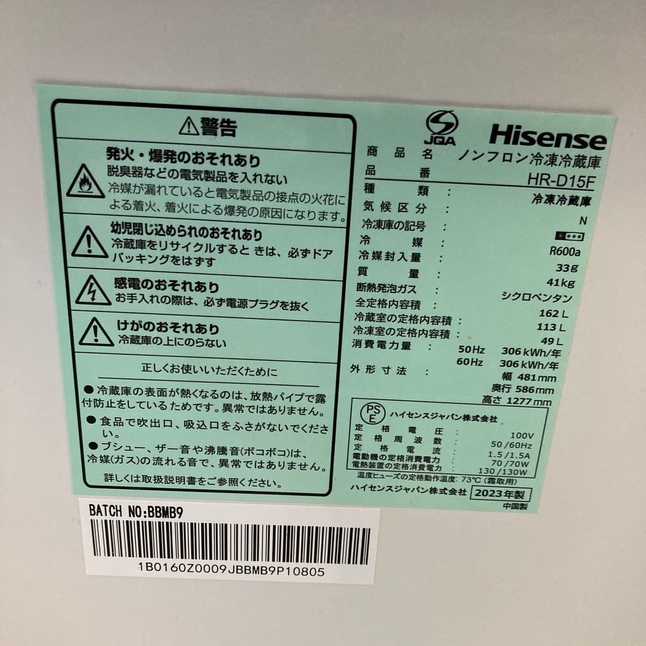 H25477 一人暮らし2D冷蔵庫 Hisense HR-D15F 2023年製 162L