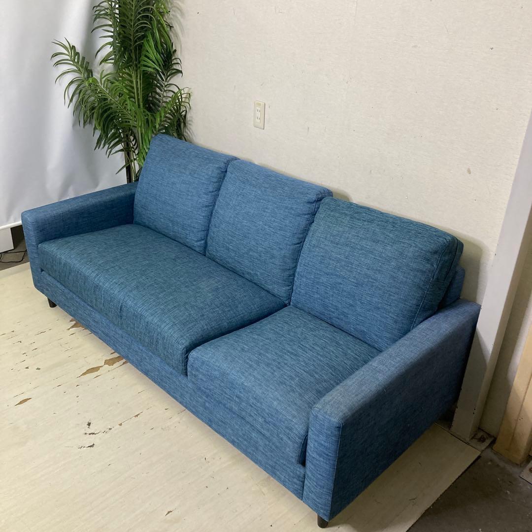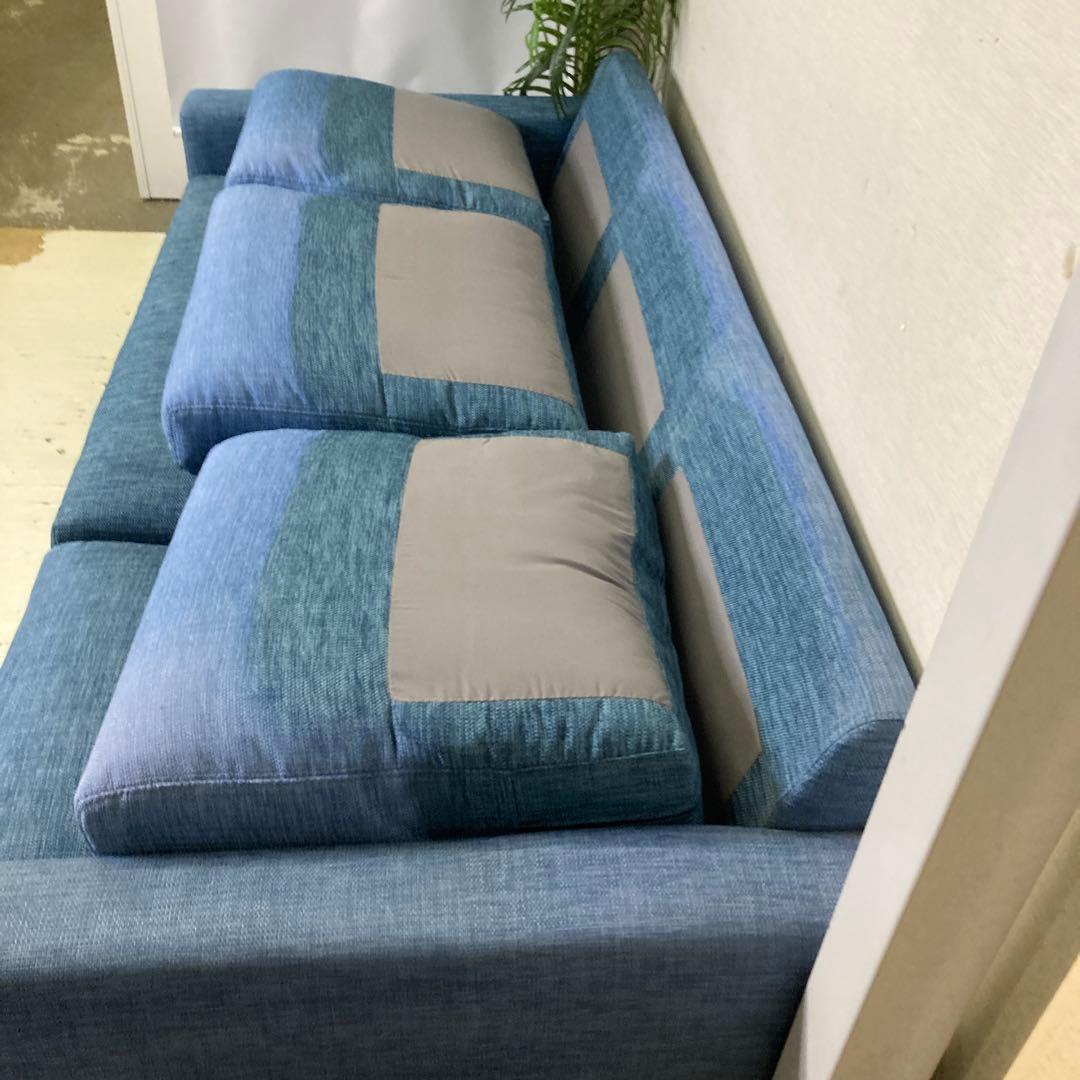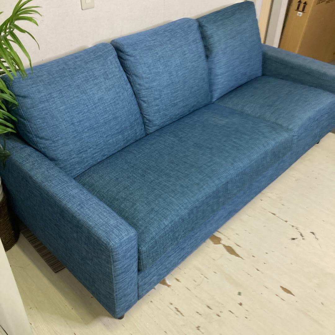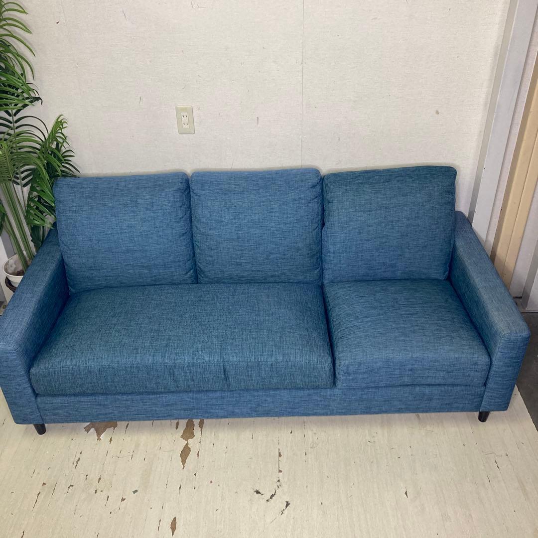 シンプルなデザインの青い3人掛けソファ、布地仕上げで快適な座り心地。