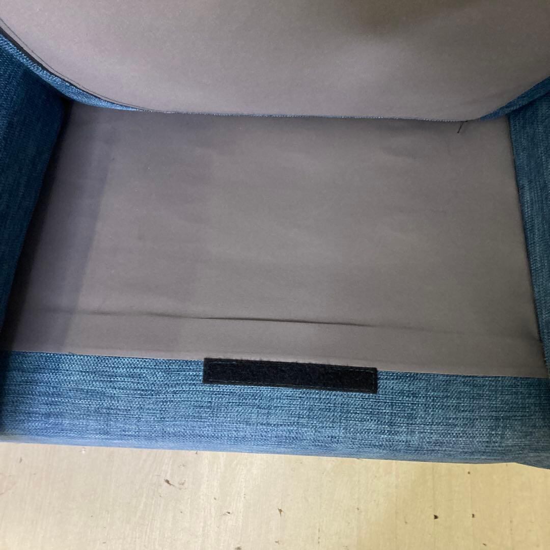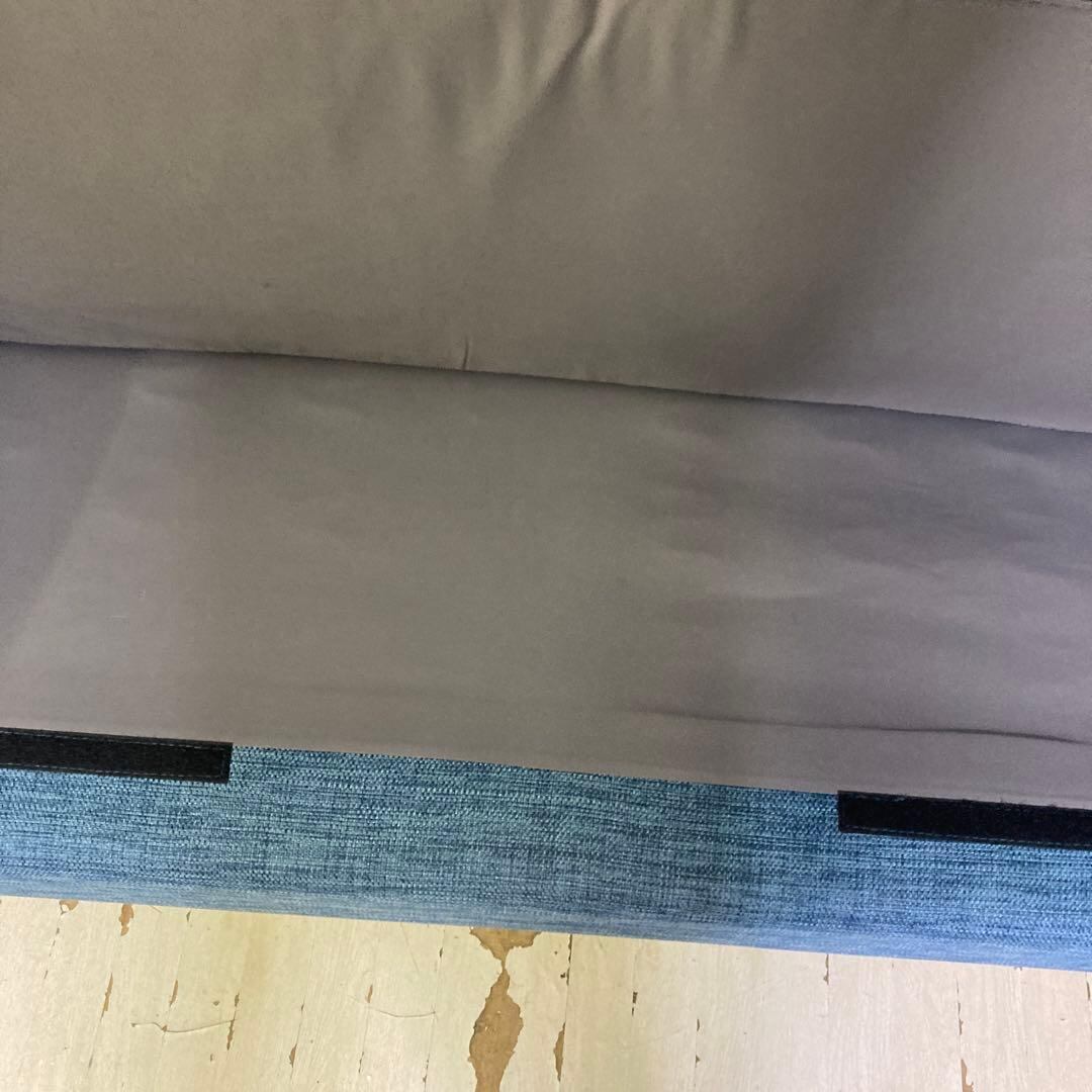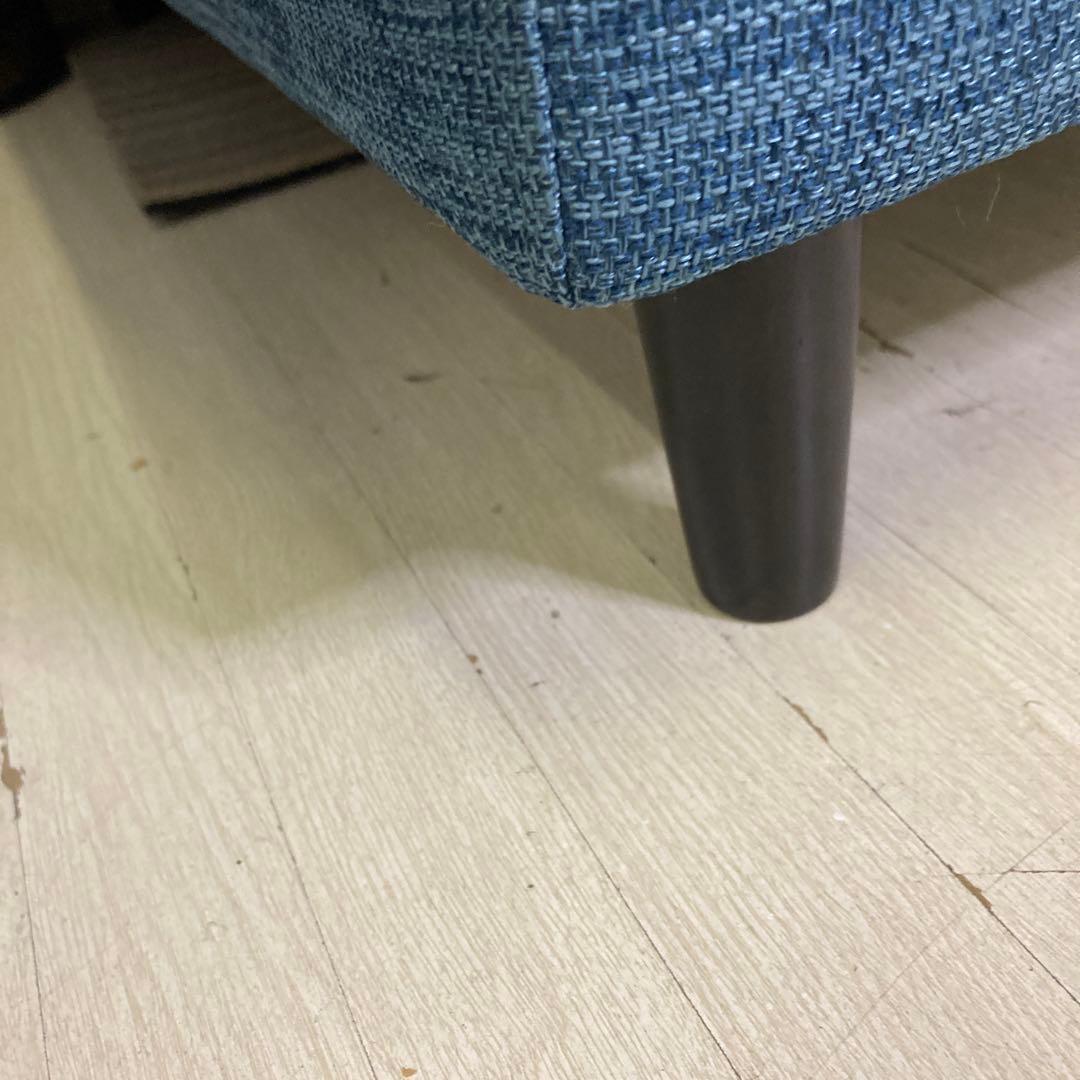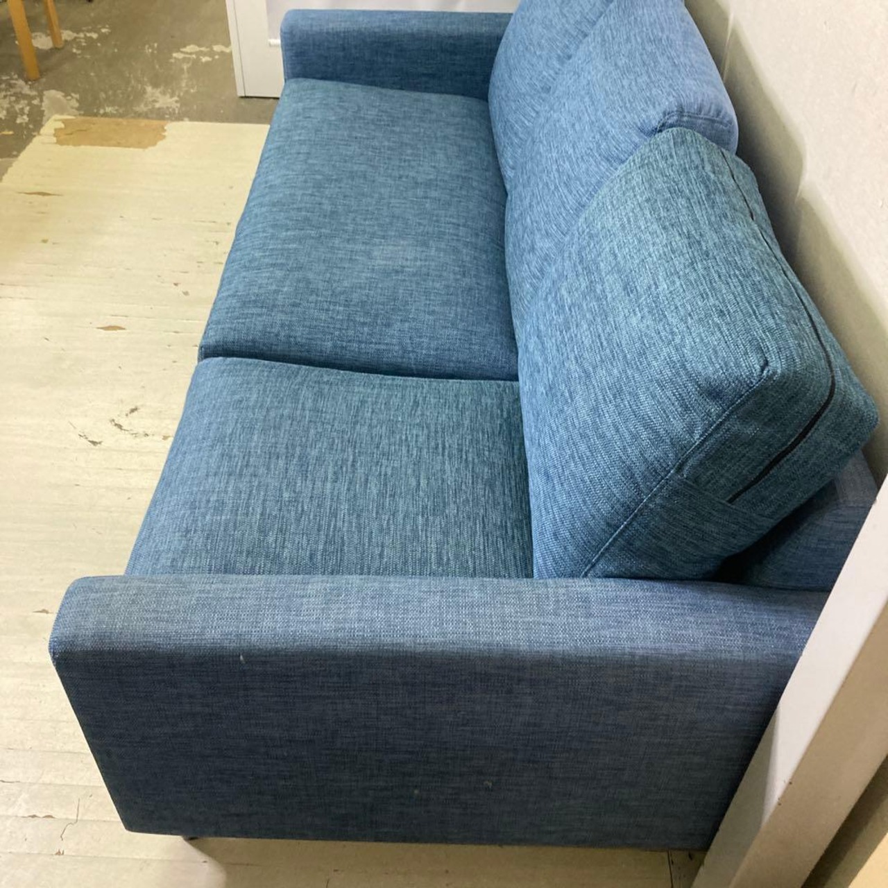 シンプルなデザインの青い3人掛けソファ、布地仕上げで快適な座り心地。
