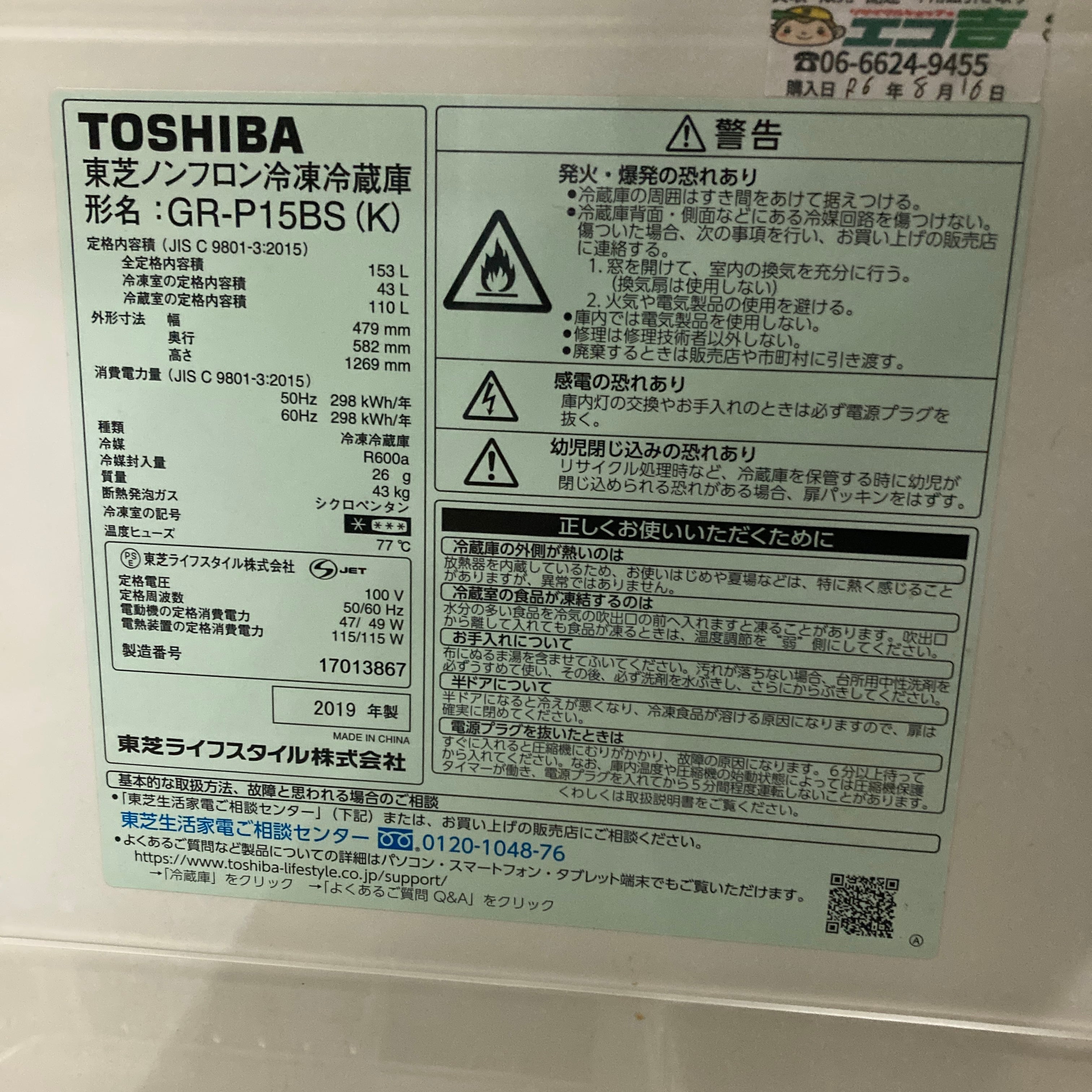 25495 一人暮らし2D冷蔵庫 TOSHIBA 2019年製 153L