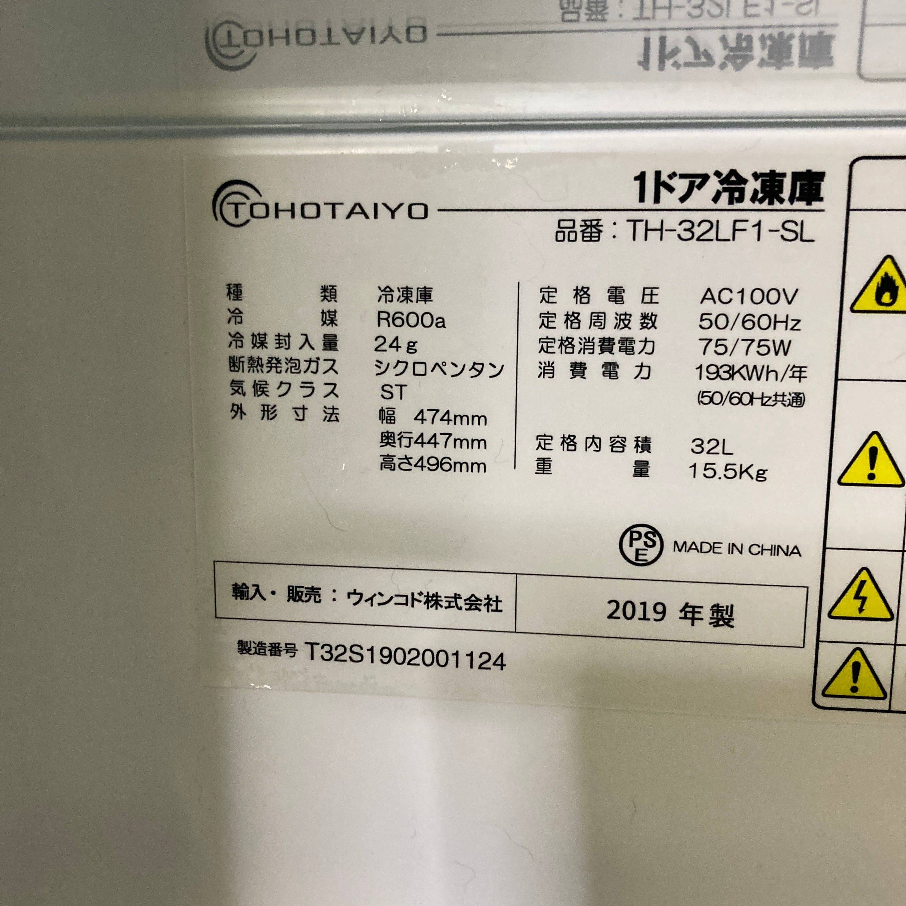 25504 1D冷凍庫 TOHOTAIYO TH-32LF1-SL 2019年製