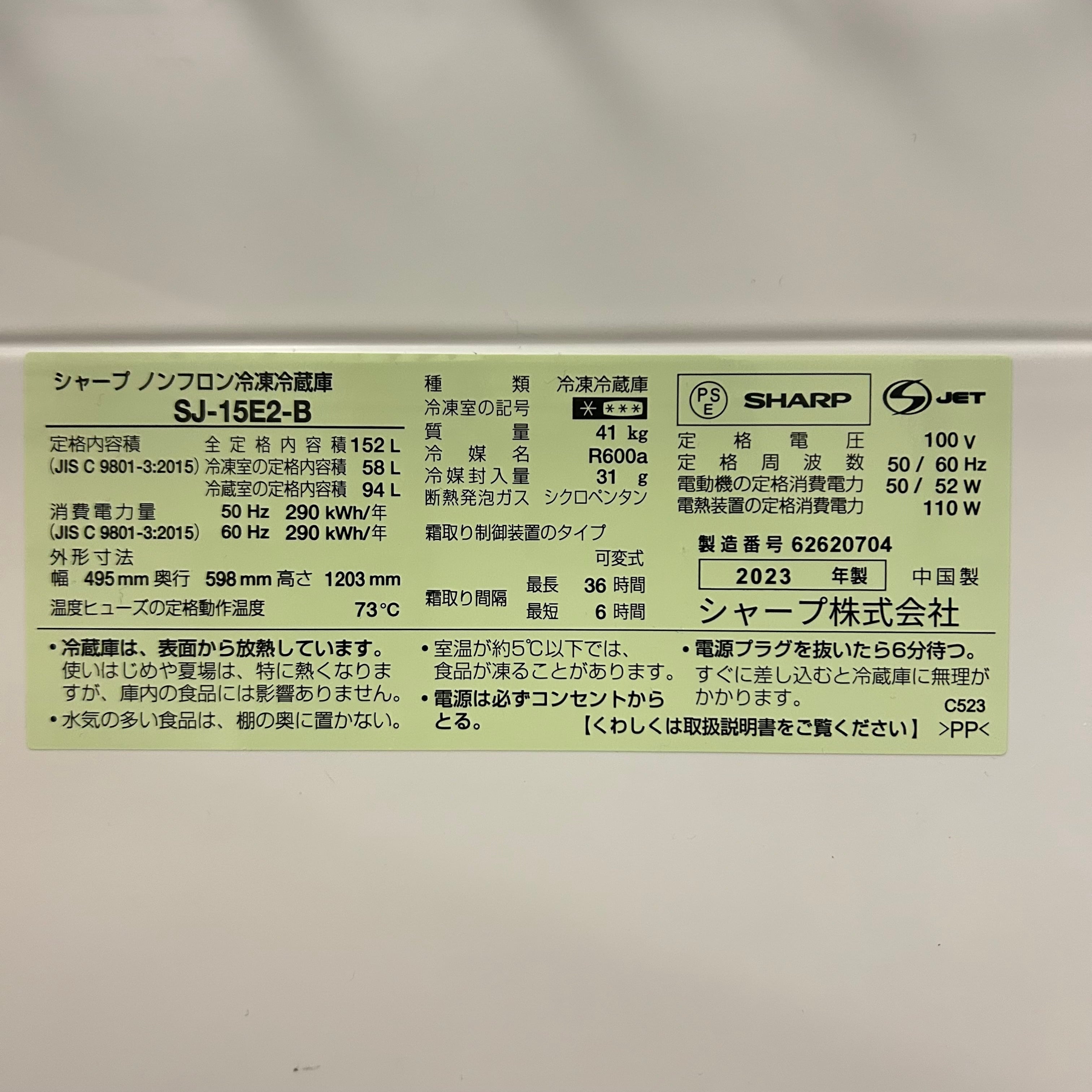 25521 一人暮らし2D冷蔵庫つけかえどっちもドア SHARP SJ-D15E2-B 2023年製 152L