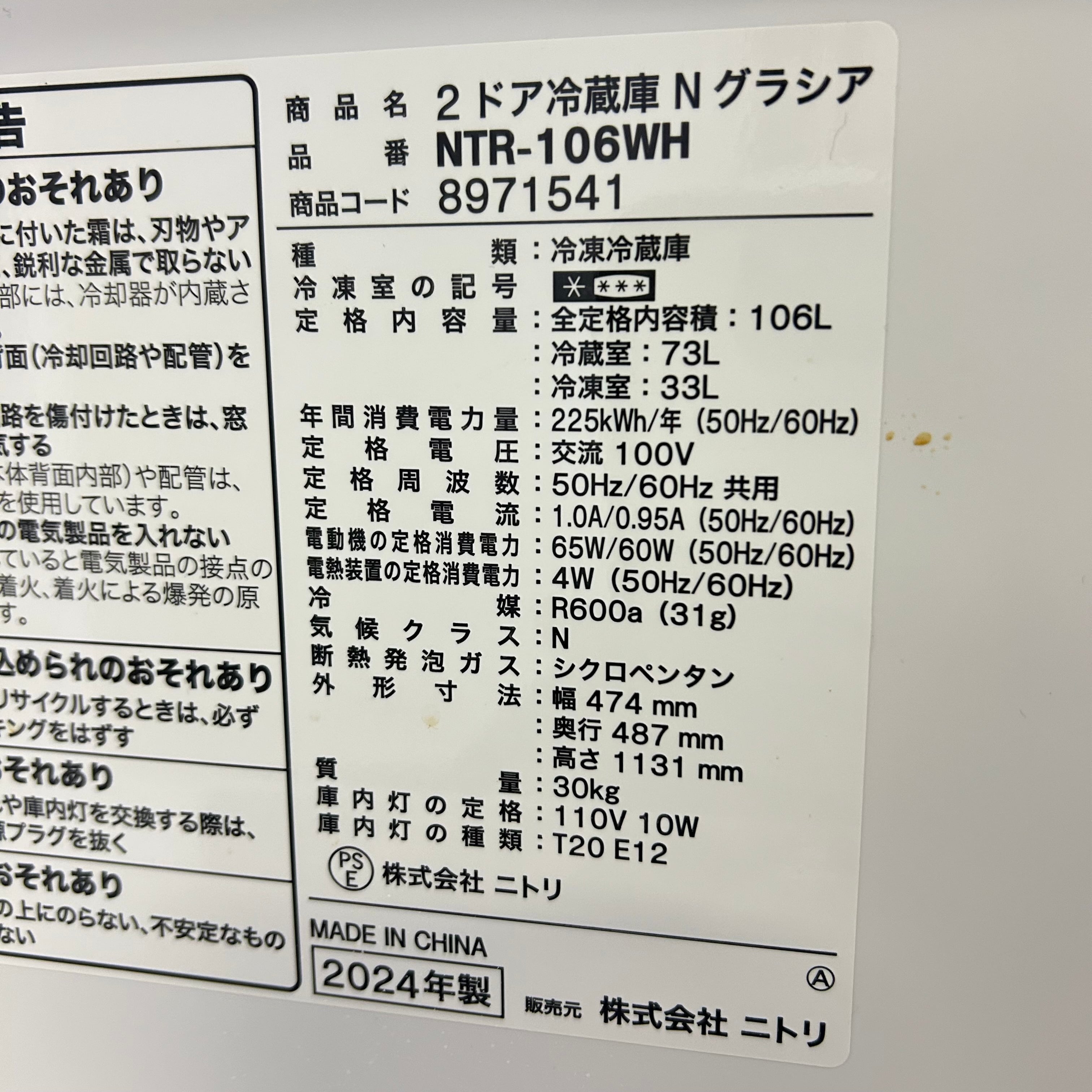 25523 一人暮らし2D冷蔵庫 Nグラシア NITORI NTR-106WH 2024年製 106L