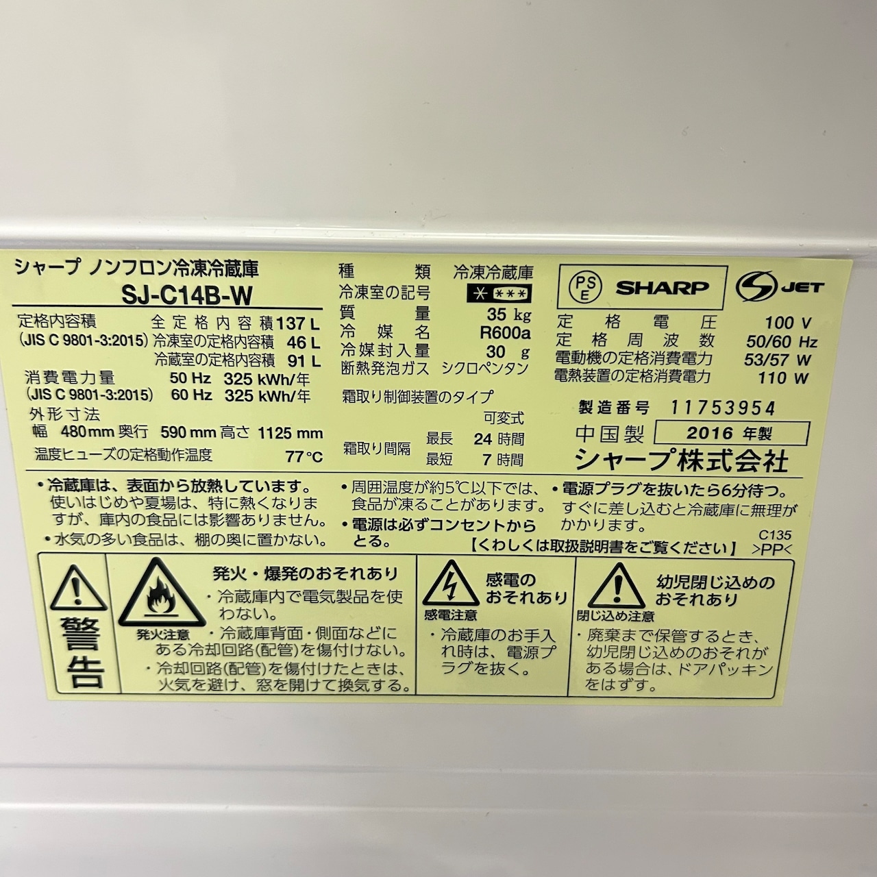 25525 一人暮らし2D冷蔵庫つけかえどっちもドア SHARP SJ-C14B-W 2016年製 137L