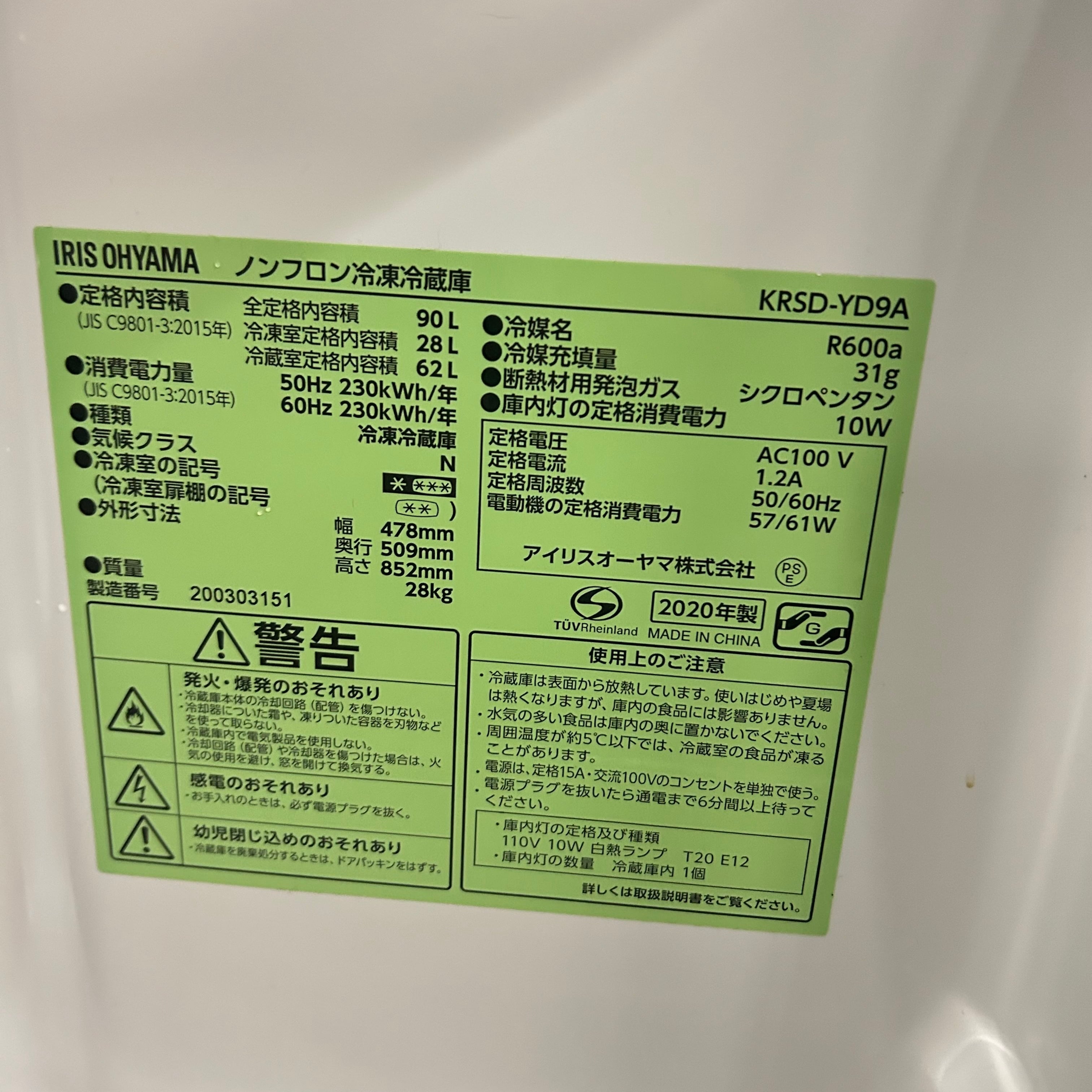 H25512 一人暮らし小型冷蔵庫 IRIS OHYAMA KRSD-YD9A 2020年製 90L