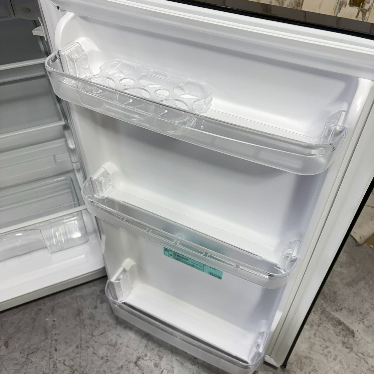 冷蔵庫はたっぷり101Lの大容量。ドアポケット下段は2Lペットボトル3本、中段はさらに500mLペットボトルや1Lの紙パック飲料が収納できる。