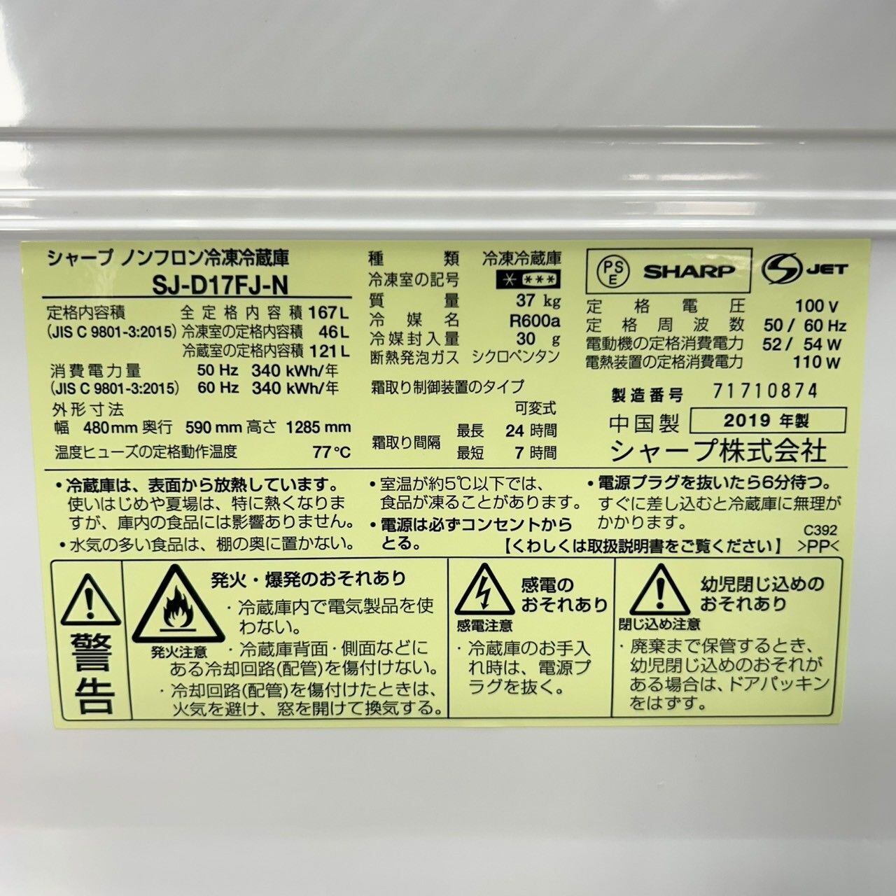 D 25622【2019年製】 冷蔵庫 洗濯機 SHARP 家電 2点セット SHARP シャープ ES-GE7C-W 7.0kg SJ-D17FJ-N 167L