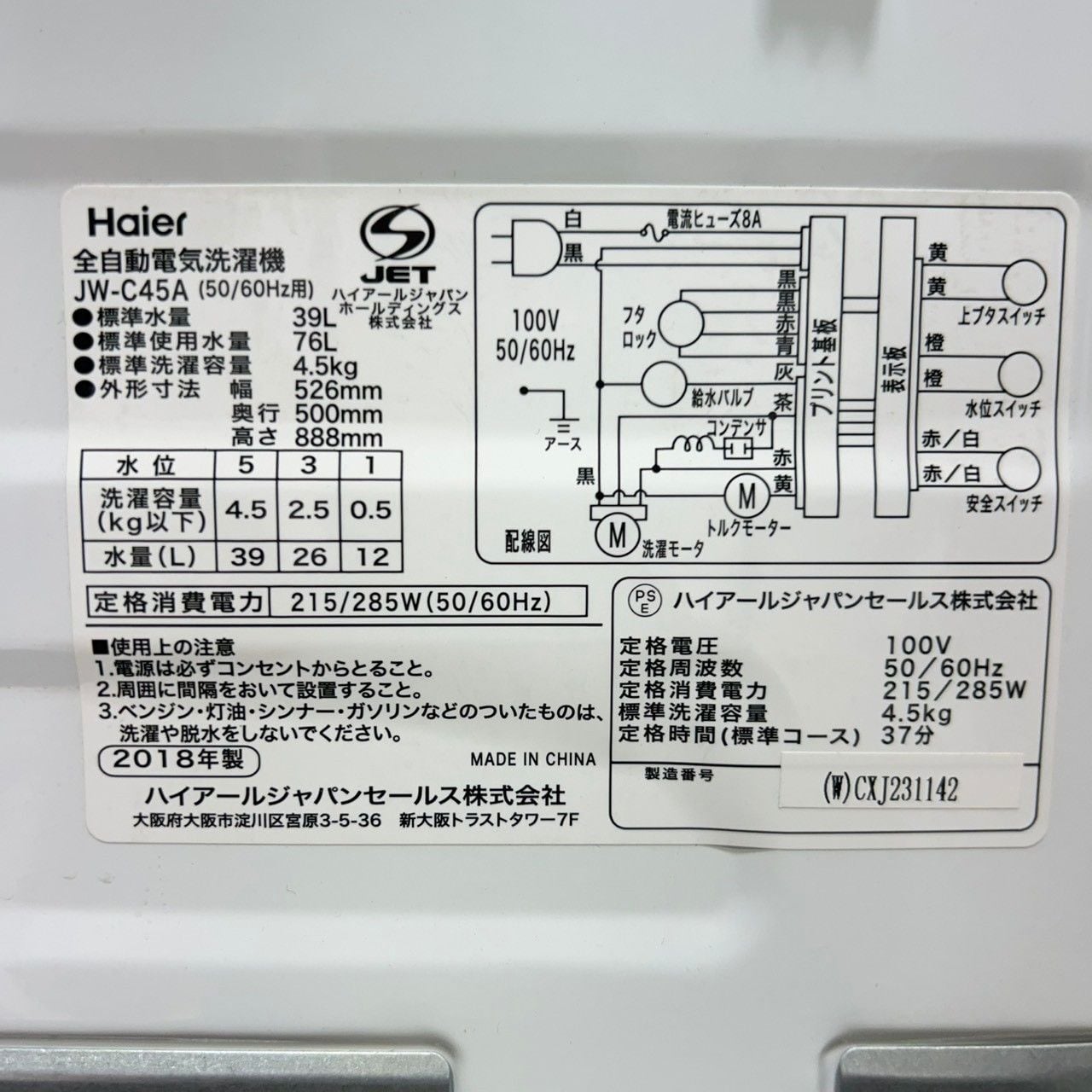 ・洗濯機 4.5kg