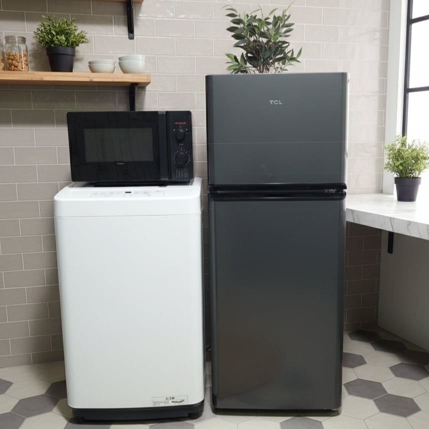 D 25629【2024-25年製】 極美品 冷蔵庫 洗濯機 電子レンジ 家電セット IRIS OHYAMA アイリスオーヤマ comfee コンフィー TCL ティーシーエル CRT114AH 114L IAW-T504 5.0kg CF-AM202-BK 50/60Hz