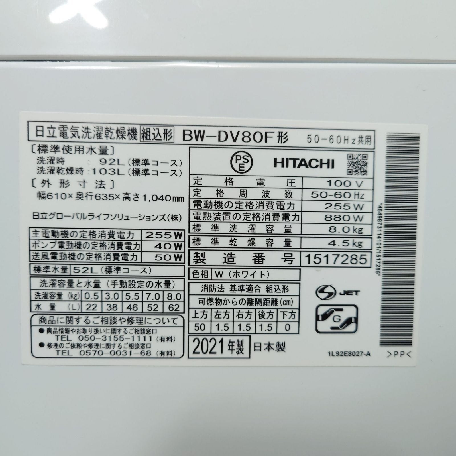 D 25648【2021年製】 家電 洗濯機 HITACHI 日立 BW-DV80F 8.0kg