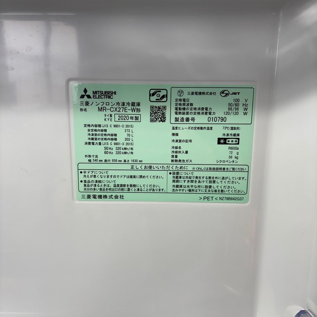 D 25653【2020年製】MITSUBISHI 三菱 MR-CX27E-W ノンフロン冷凍冷蔵庫 270L