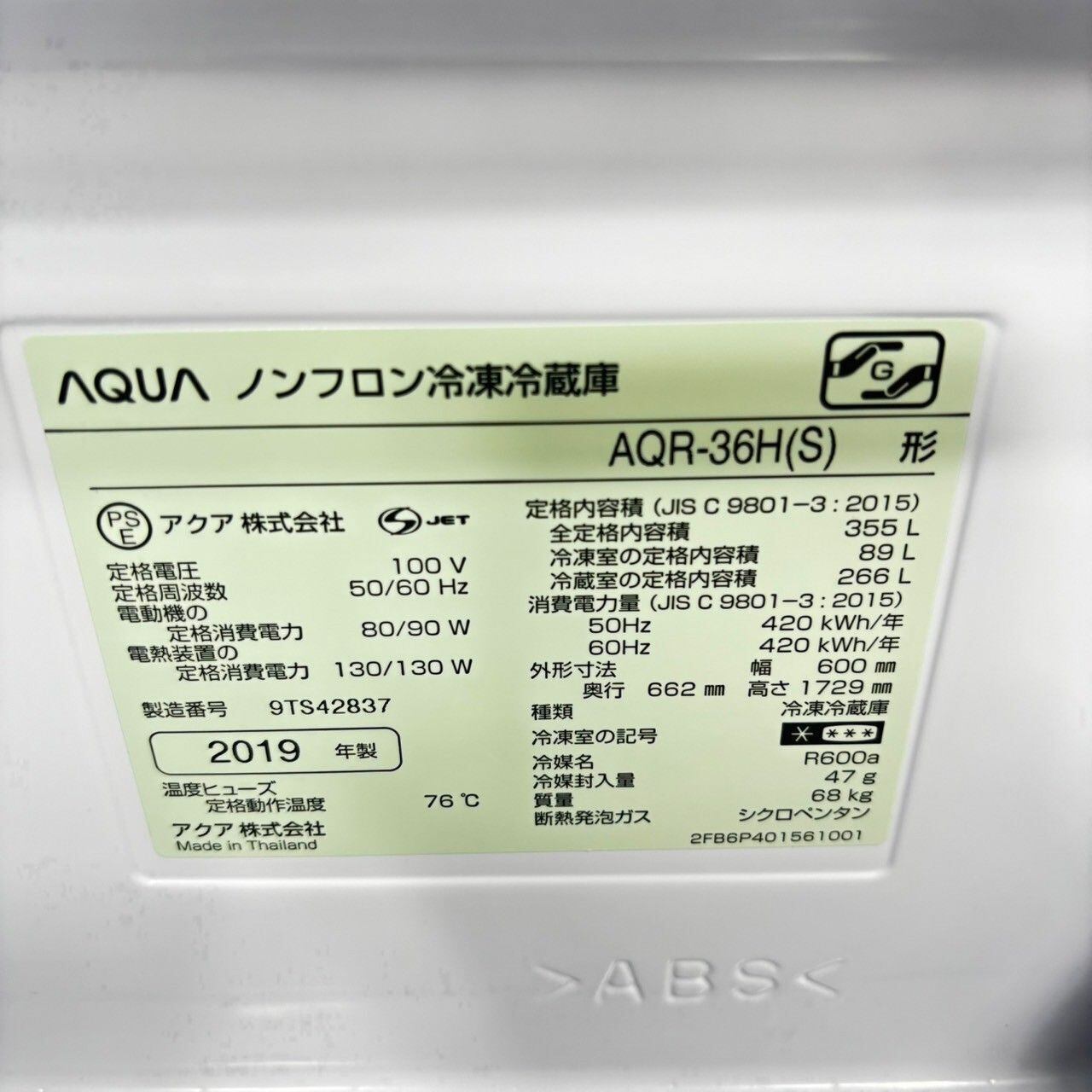 D 25662【2019年製】 AQUA アクア AQR-36H ノンフロン冷凍冷蔵庫 355L