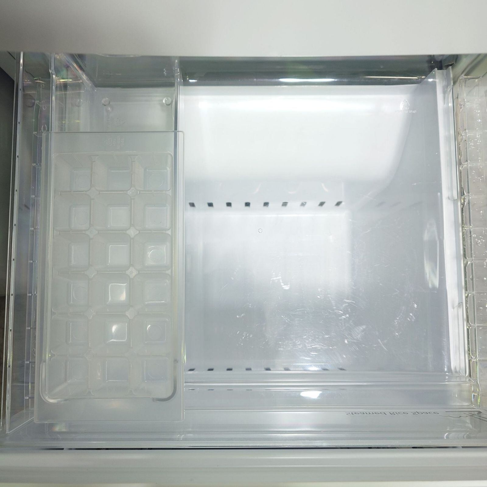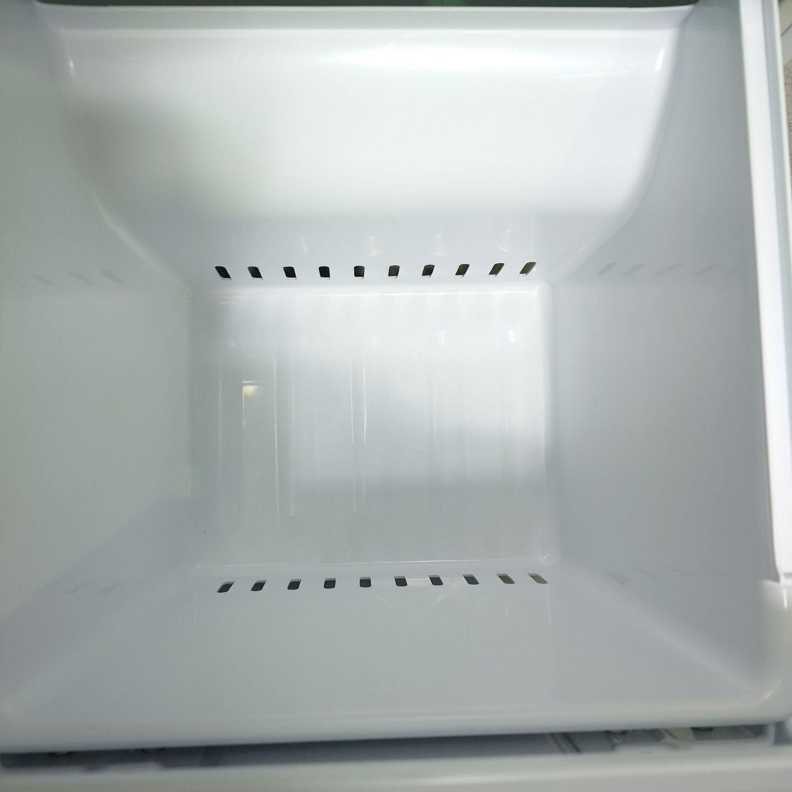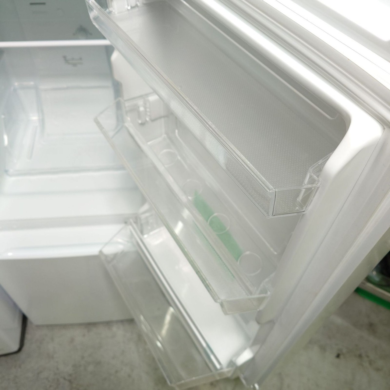 冷蔵室下部に大容量のフリーケースがあり、野菜やチルド食品の収納に便利。冷凍室の面倒な霜取りが不要な「ファン式」を採用。