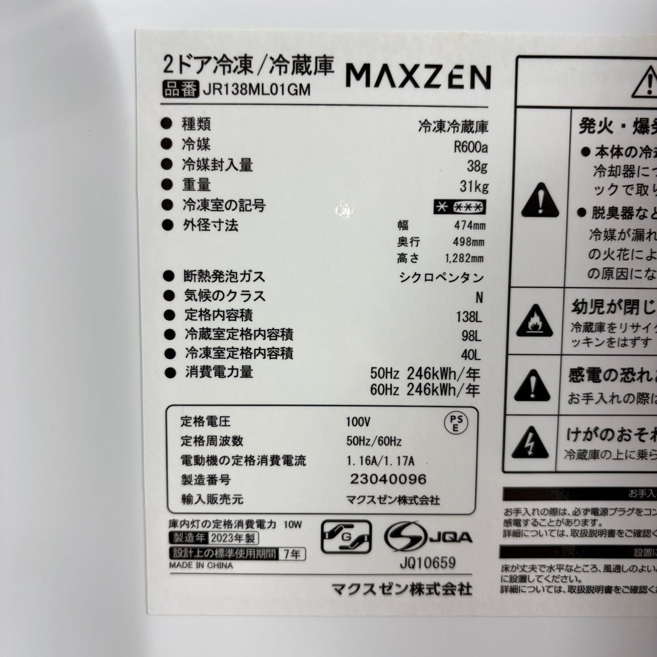 冷蔵: 98L
