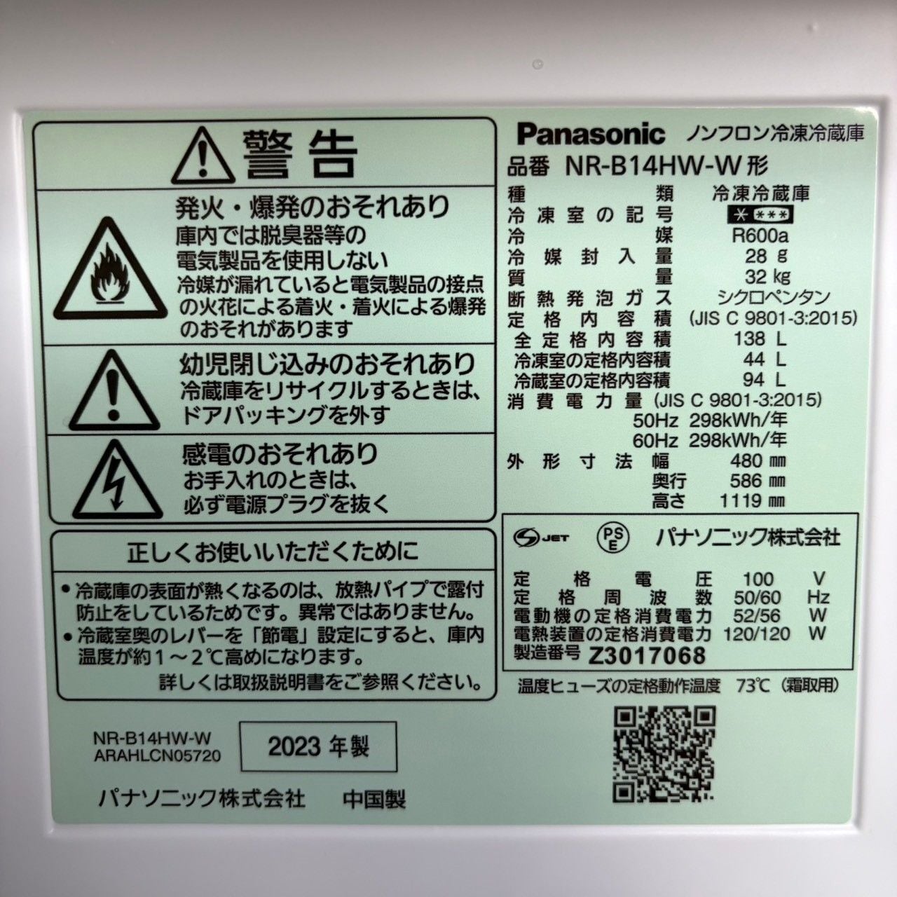 D 25691【2023年製】 美品 家電 Panasonic パナソニック 冷蔵庫 NR-B14HW-W 138L