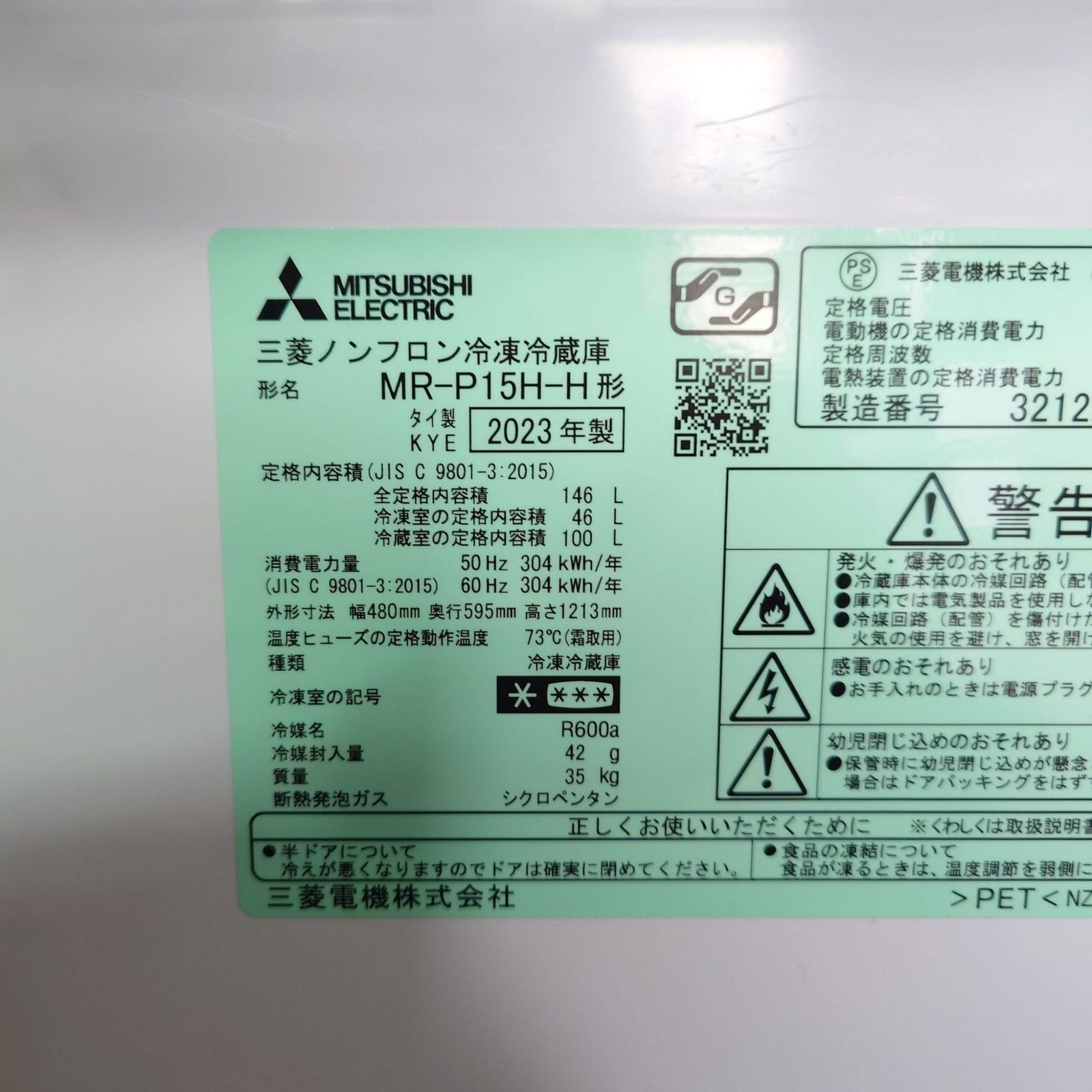 D 25696【2023年製】 極美品 家電 MITSUBISHI 三菱 冷蔵庫 MR-P15H-H 146L