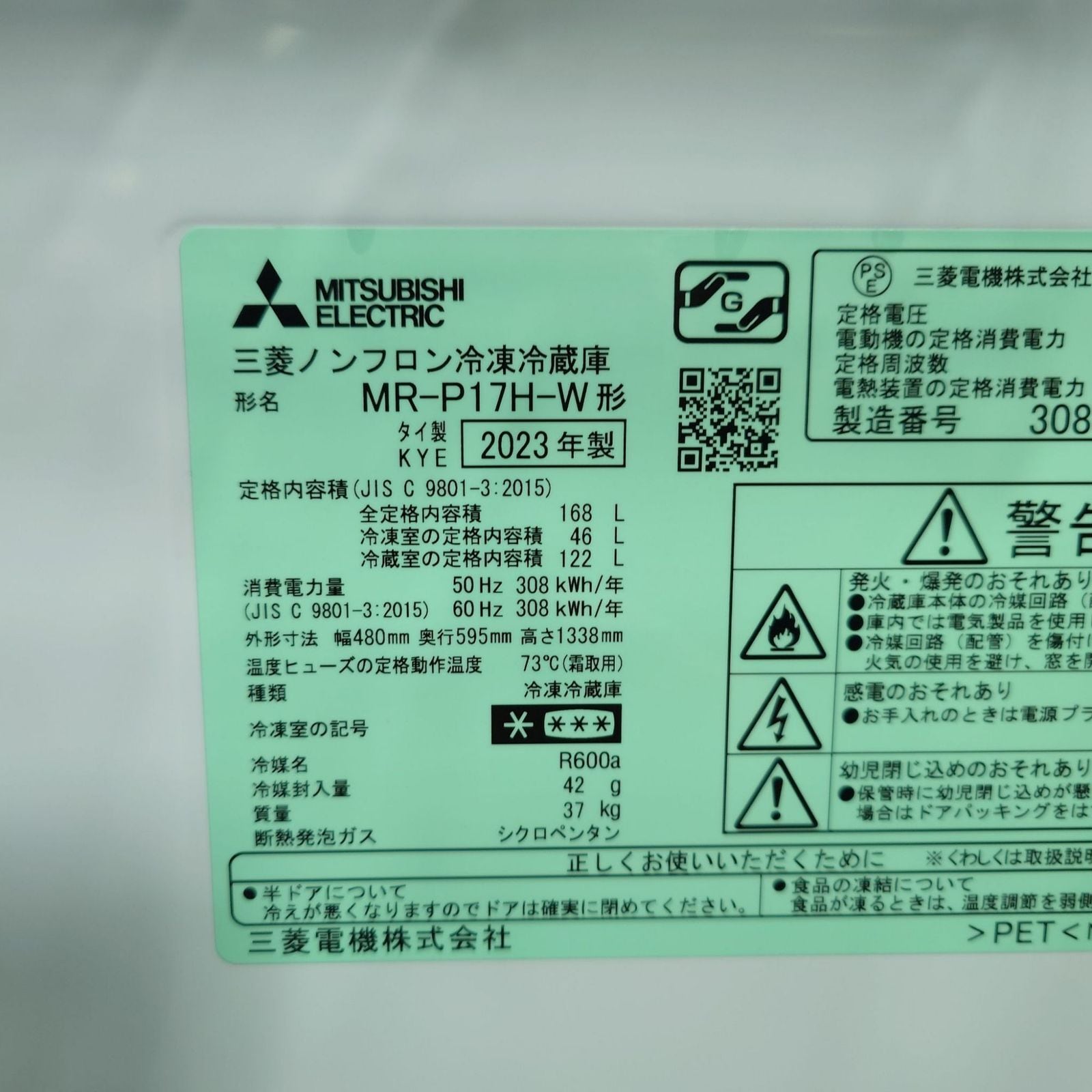 D 25698【2023年製】 極美品 家電 冷蔵庫 MITSUBISHI 三菱 MR-P17H-W 168L