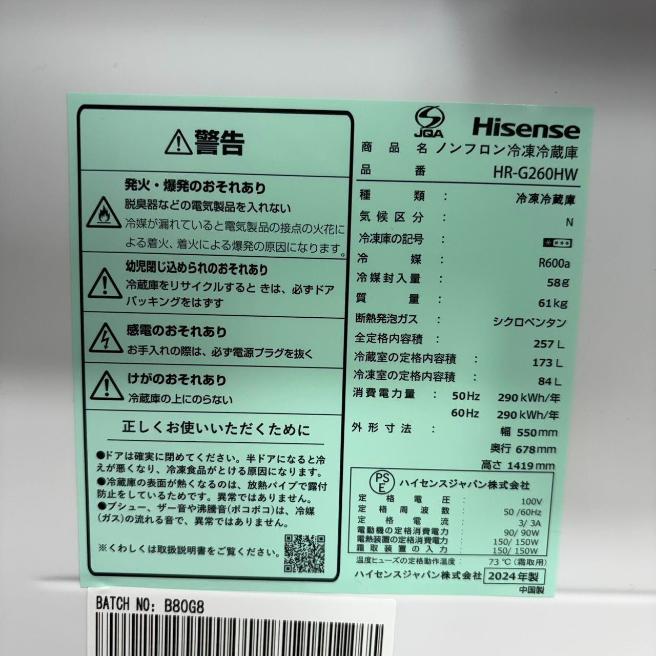 D 25707【2024年製】極美品 大容量 Hisense ハイセンス 冷蔵庫 家電 HR-G260HW 257L