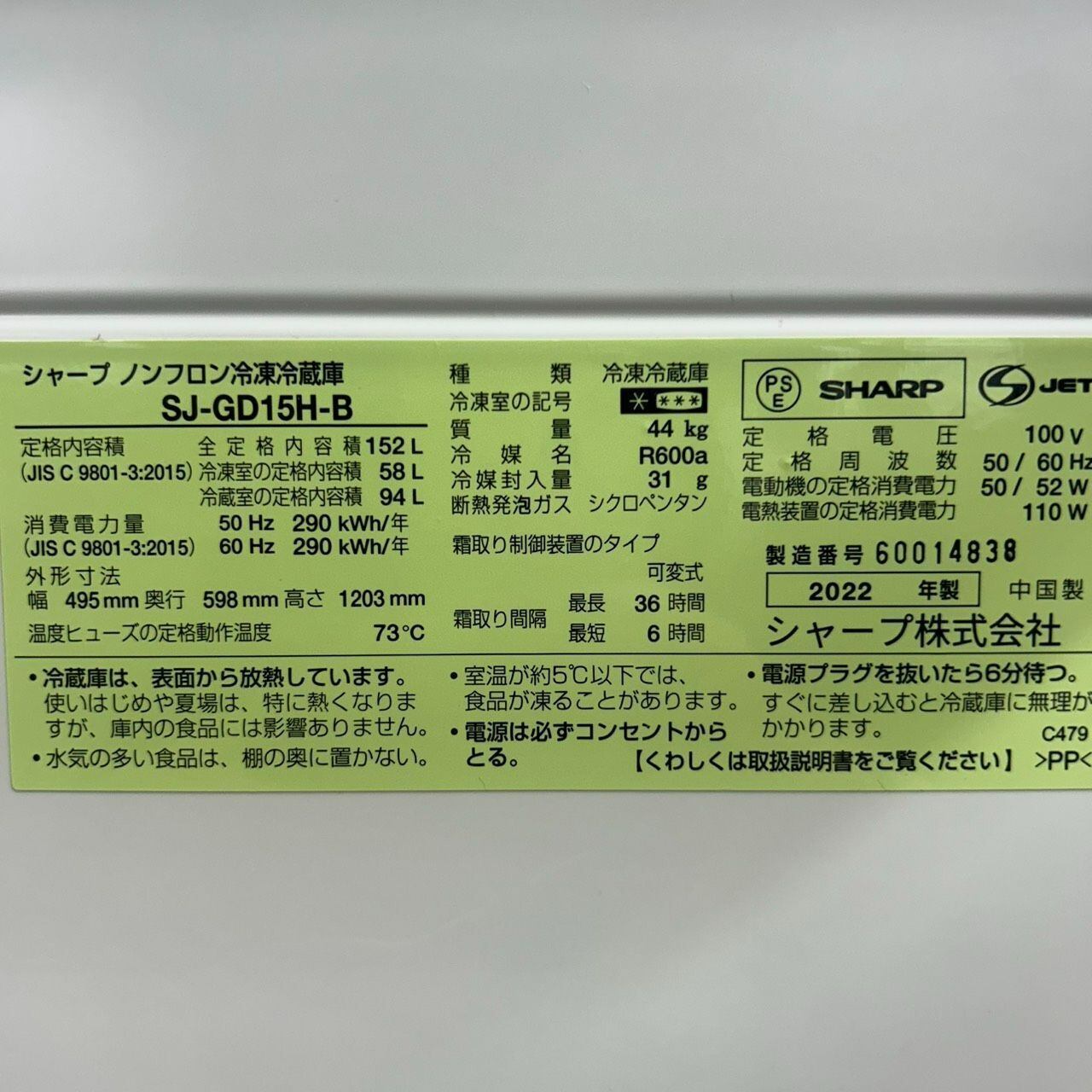 D 25713【2022年製】 美品 冷蔵庫 SHARP シャープ SJ-GD15H-B 152L