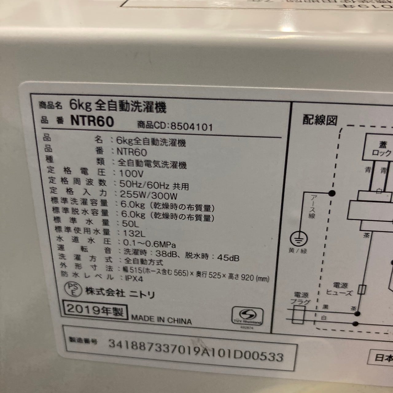 25761 一人暮らし洗濯機 NITORI NTR60 2019年製 6.0kg