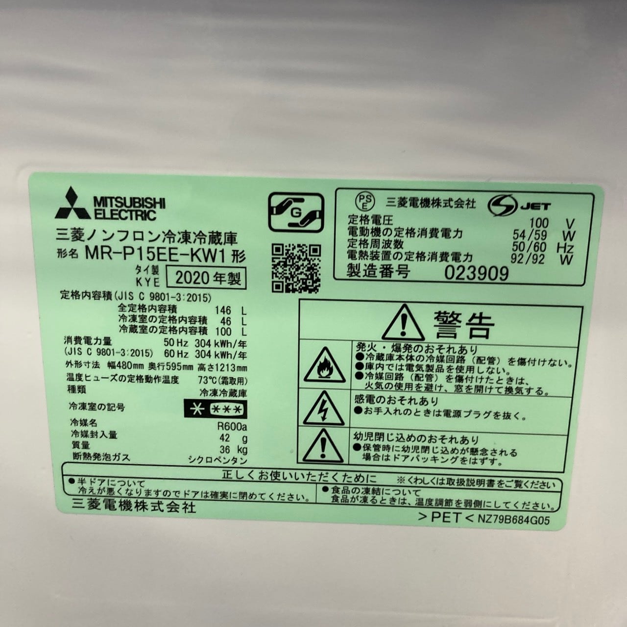 25768 一人暮らし冷蔵庫 三菱電機 MR-P15EE-KW1 2020年製 146L