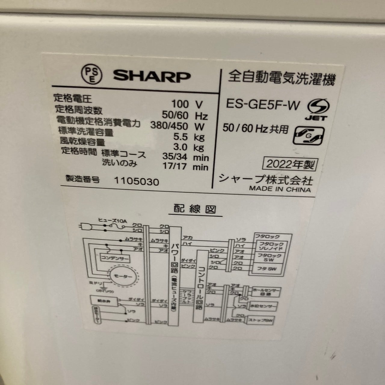 25769 一人暮らし洗濯機 SHARP ES-GE5F-W 2022年製 5.5kg