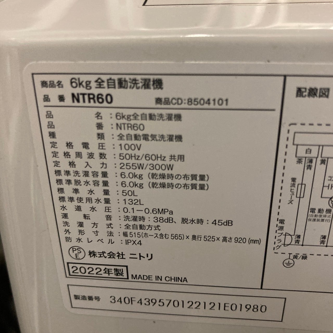 H25846 一人暮らし洗濯機 NITORI NTR60 2022年製 6.0kg