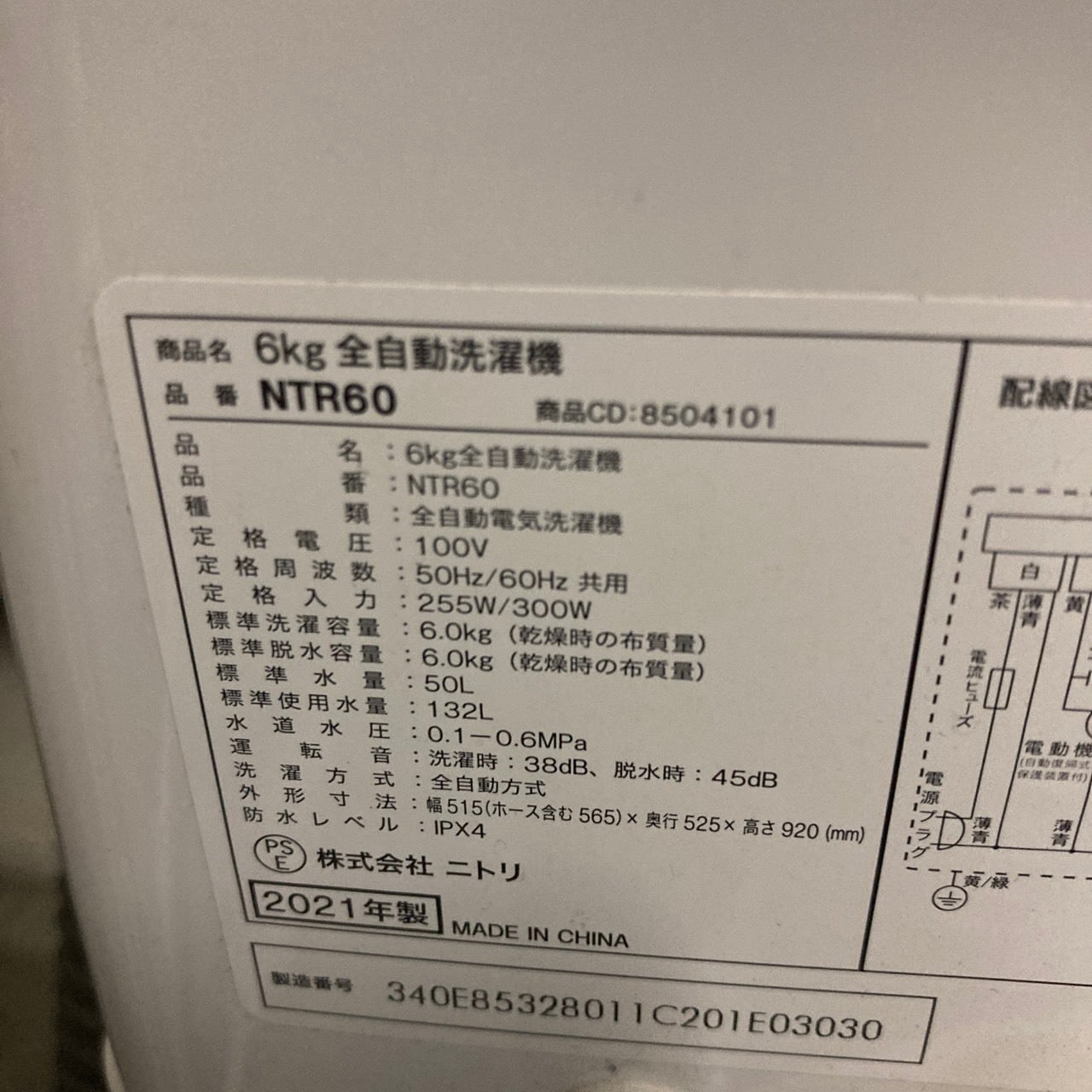 H25904 6kg 全自動洗濯機 NITORI NTR60 2021年 6.0 kg