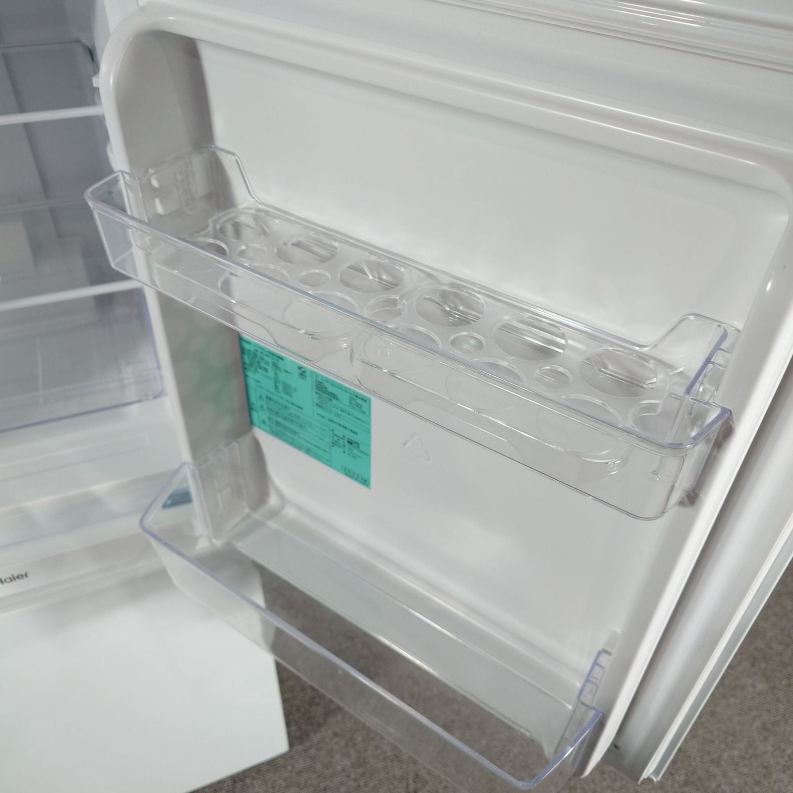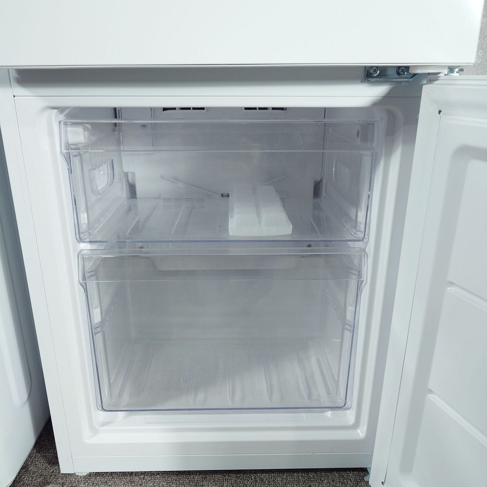 冷凍室には引き出し式クリアバスケットを採用し、透明で奥まで見やすく出し入れがスムーズ。冷蔵室のドアポケットに2Lペットボトルを3本収納できる。
