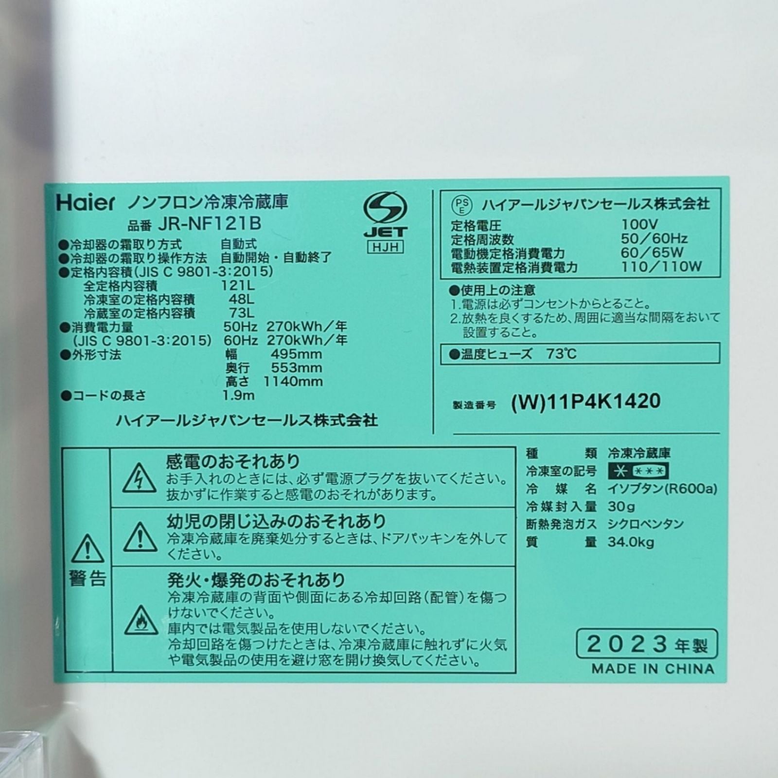 ▶型番: JR-NF121B AQW-S5M YMW17RK