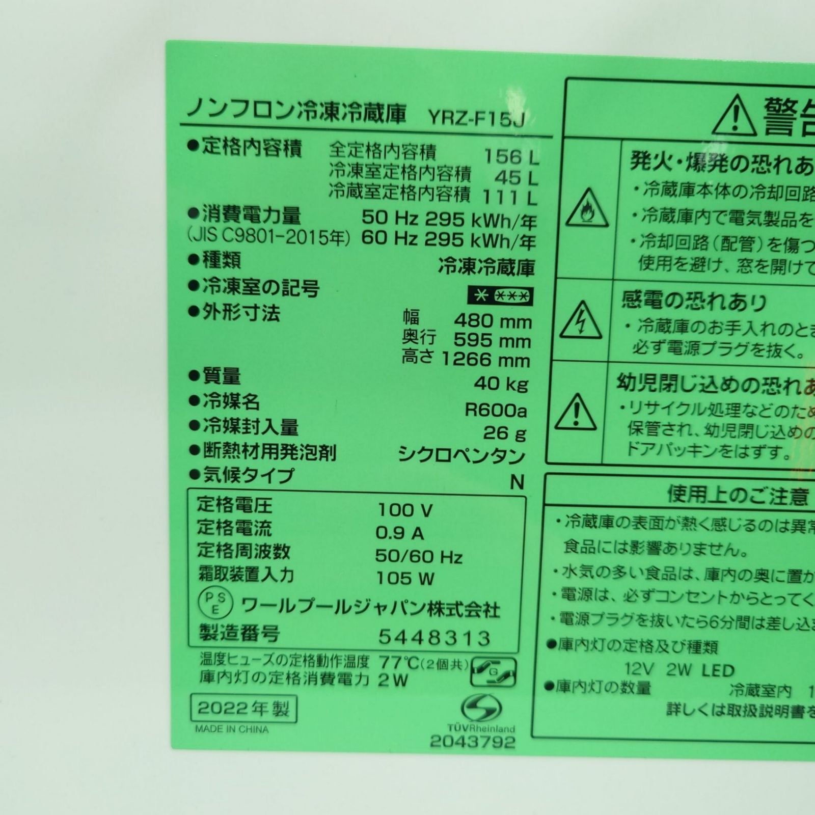 D 25943【2022年製】 家電 YAMADA ヤマダセレクトセット 冷蔵庫 TRZ-F15J 156L 洗濯機 YWM-T50H1 5.0kg