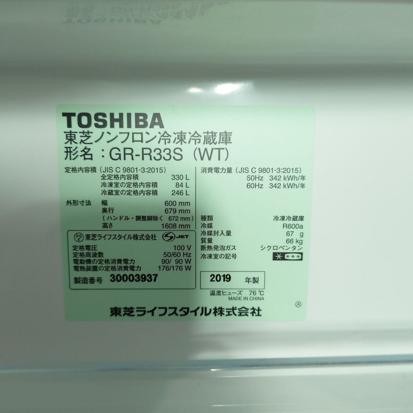 D 25951【2019年製】 TOSHIBA 東芝 家電 冷凍冷蔵庫 GR-R33S 330L