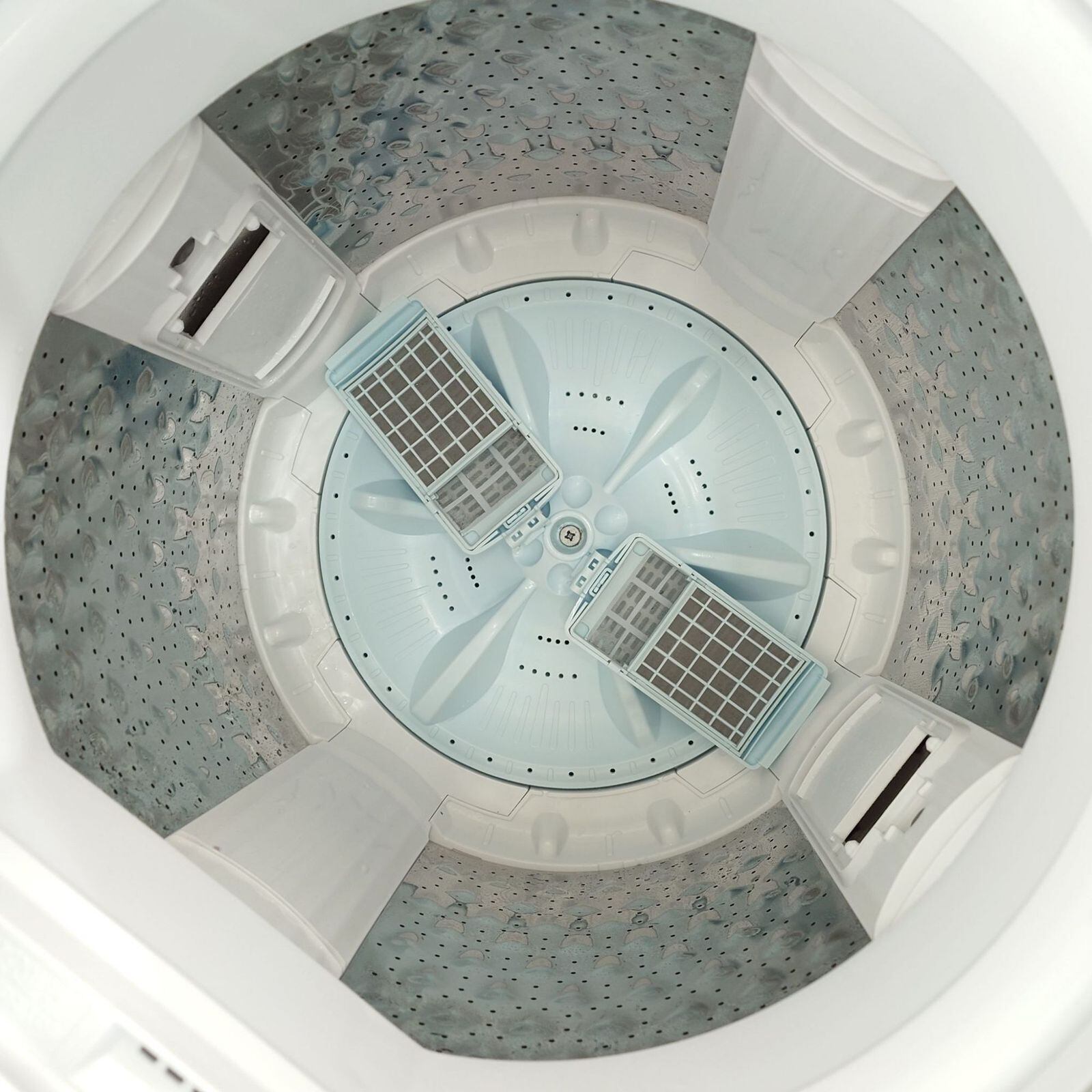 「Wシャワー洗浄」でしっかり洗う縦型全自動洗濯機。2本のシャワーで洗浄液を衣類全体にしっかり浸透させ、ムラを抑えてきれいに洗う。