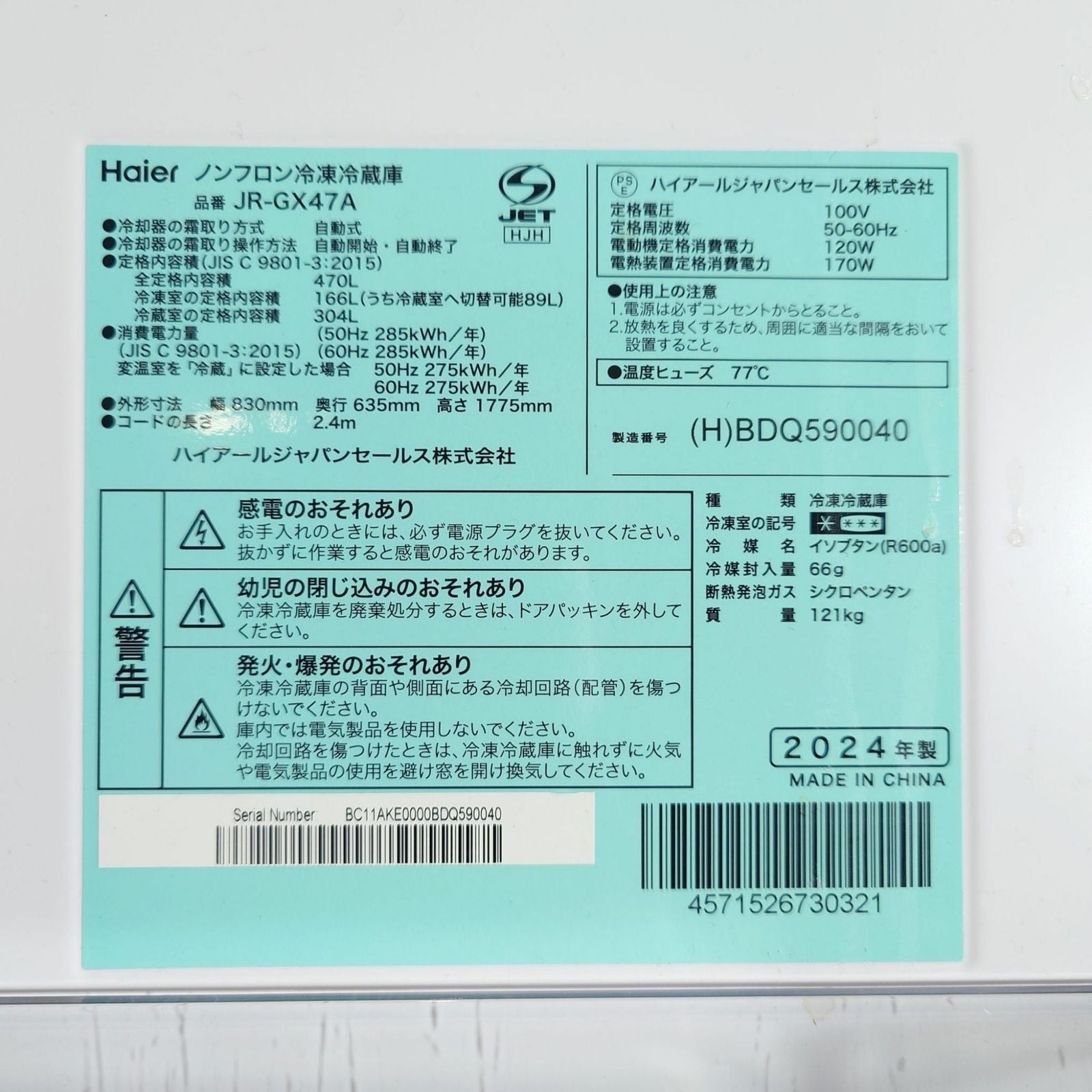 D 25965【2024年製】 美品 家電 Haier ハイアール 冷凍冷蔵庫 JR-GX47A 470L