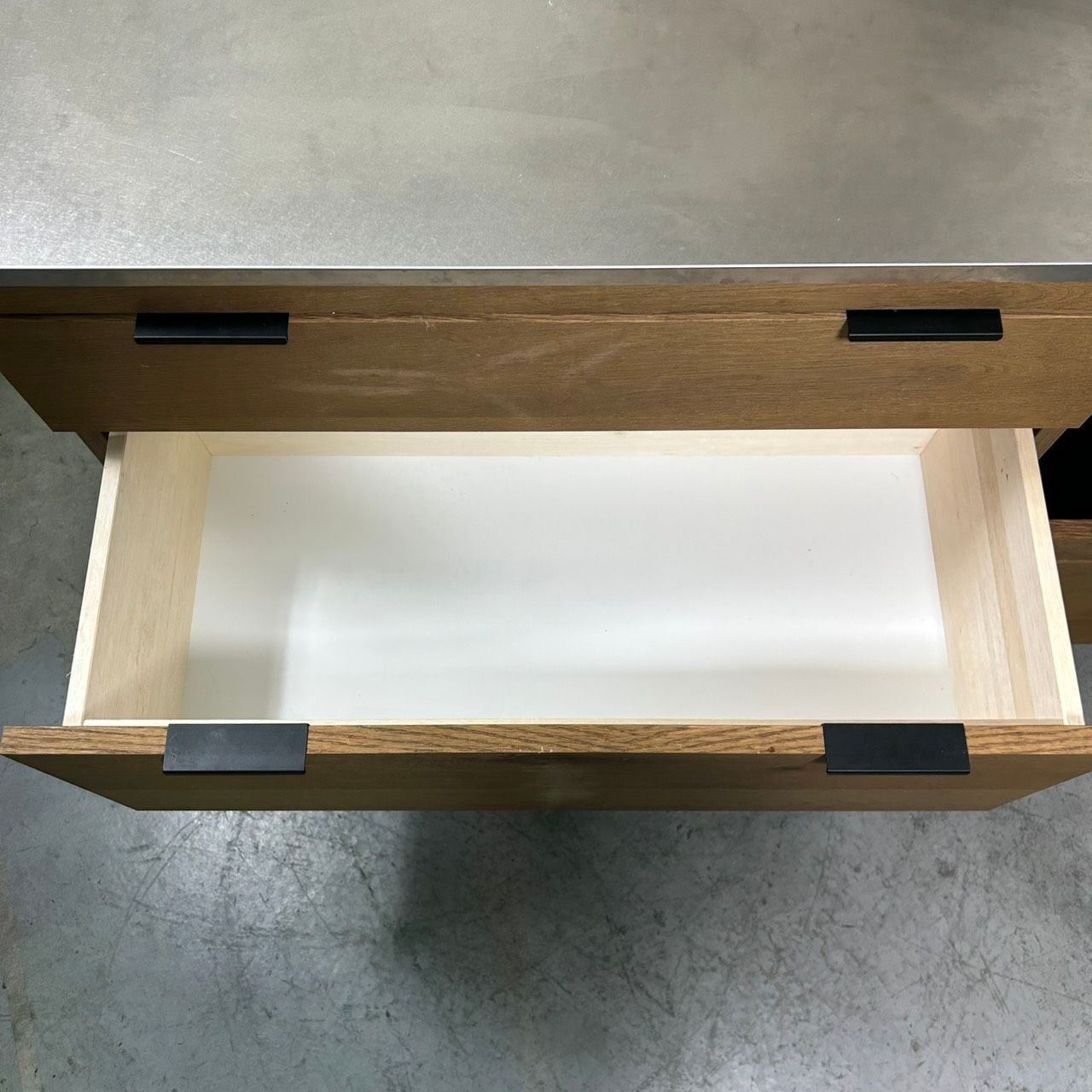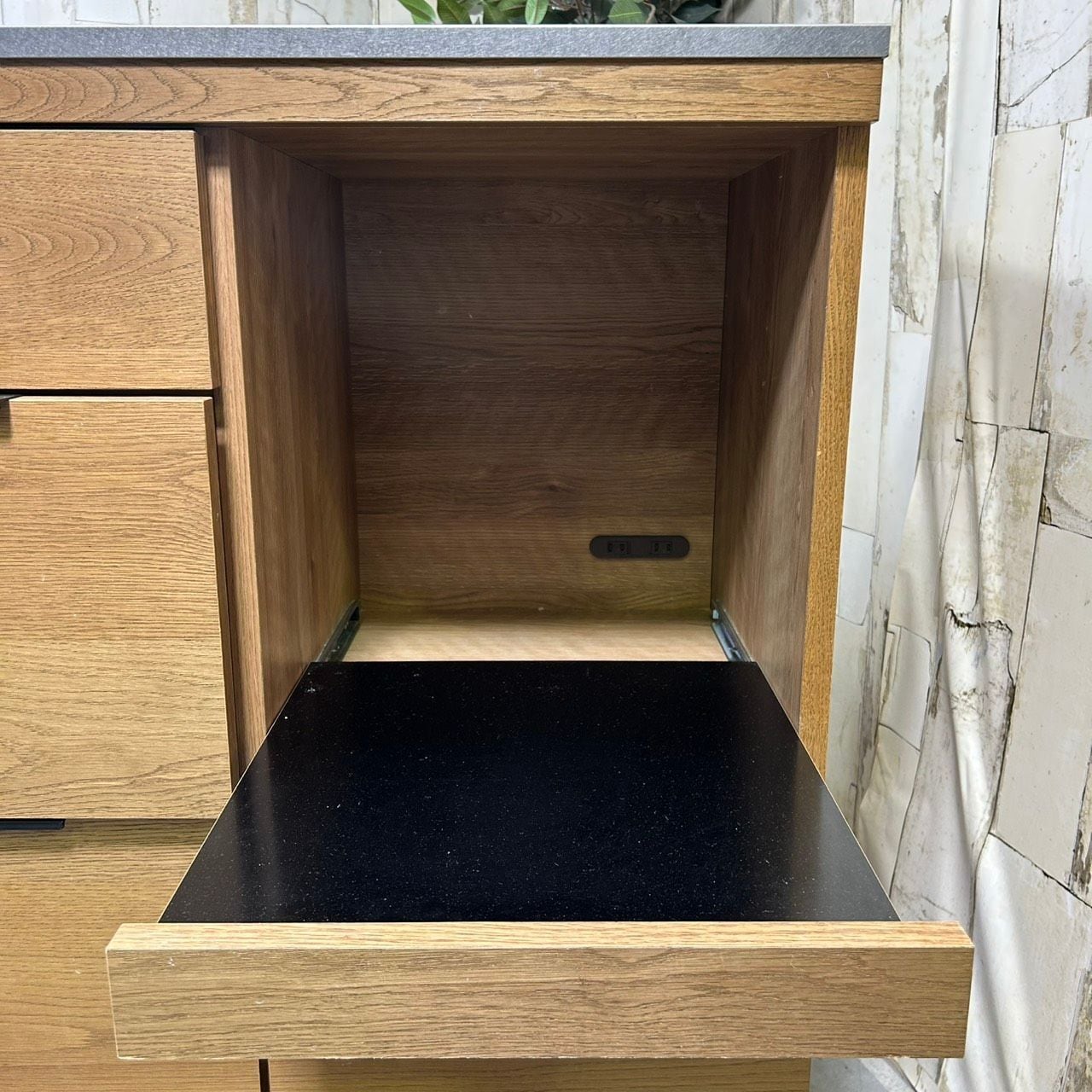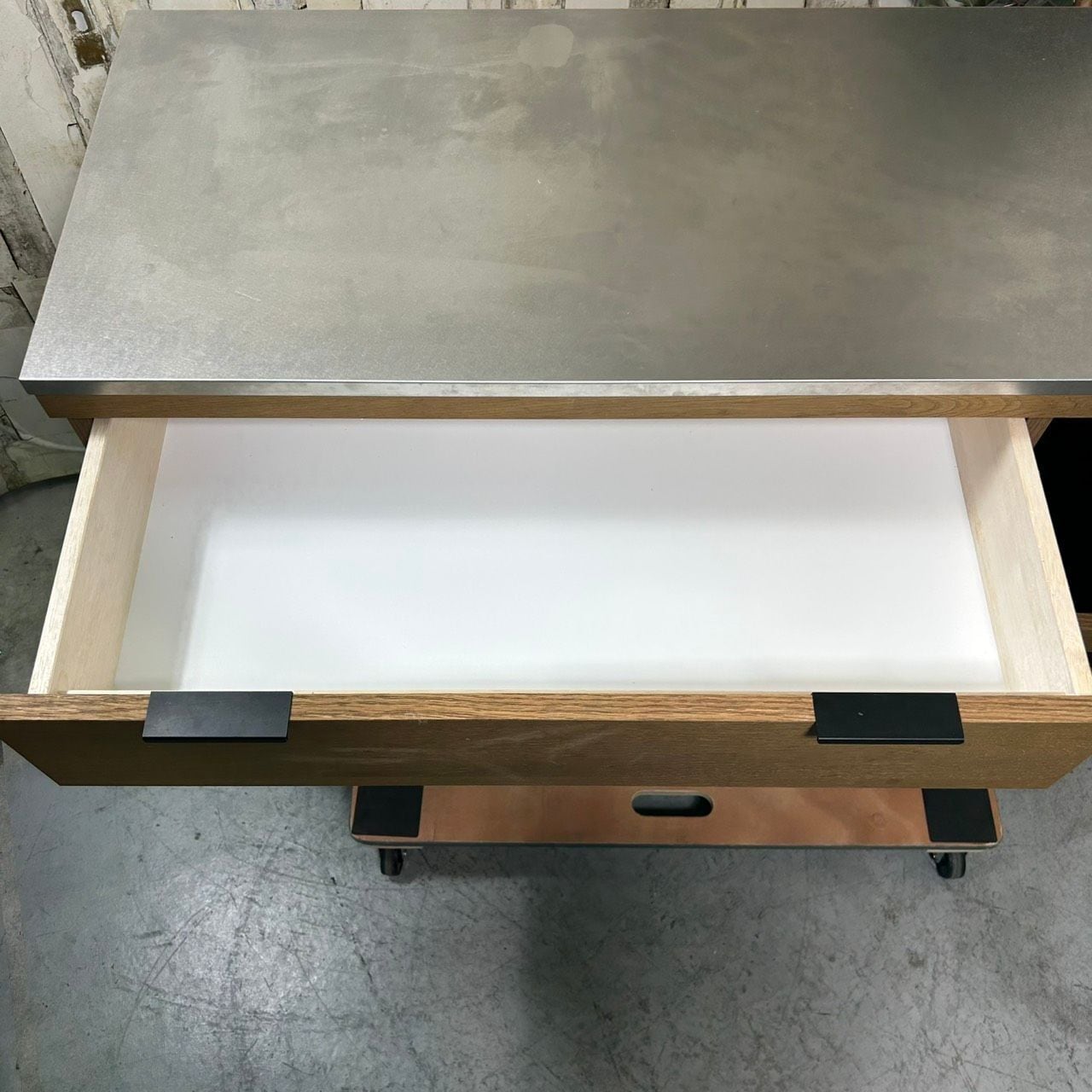 ブラックアルミの取っ手がシャープな印象を与えるアクセントに。傷が目立ちにくいステンレスの天板は耐久性が高く、日々のお手入れに便利です。引き出しには、調理器具やこまごました物をたっぷりしまって。コンセント付きの便利なスライド棚には、家電をすっきり収納できます。