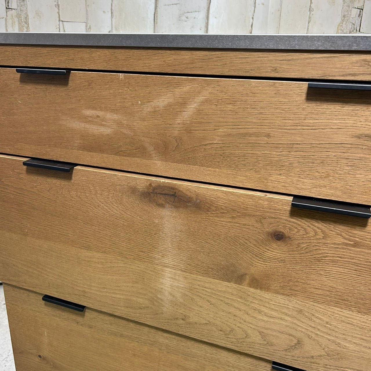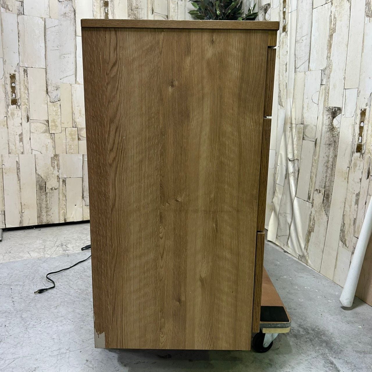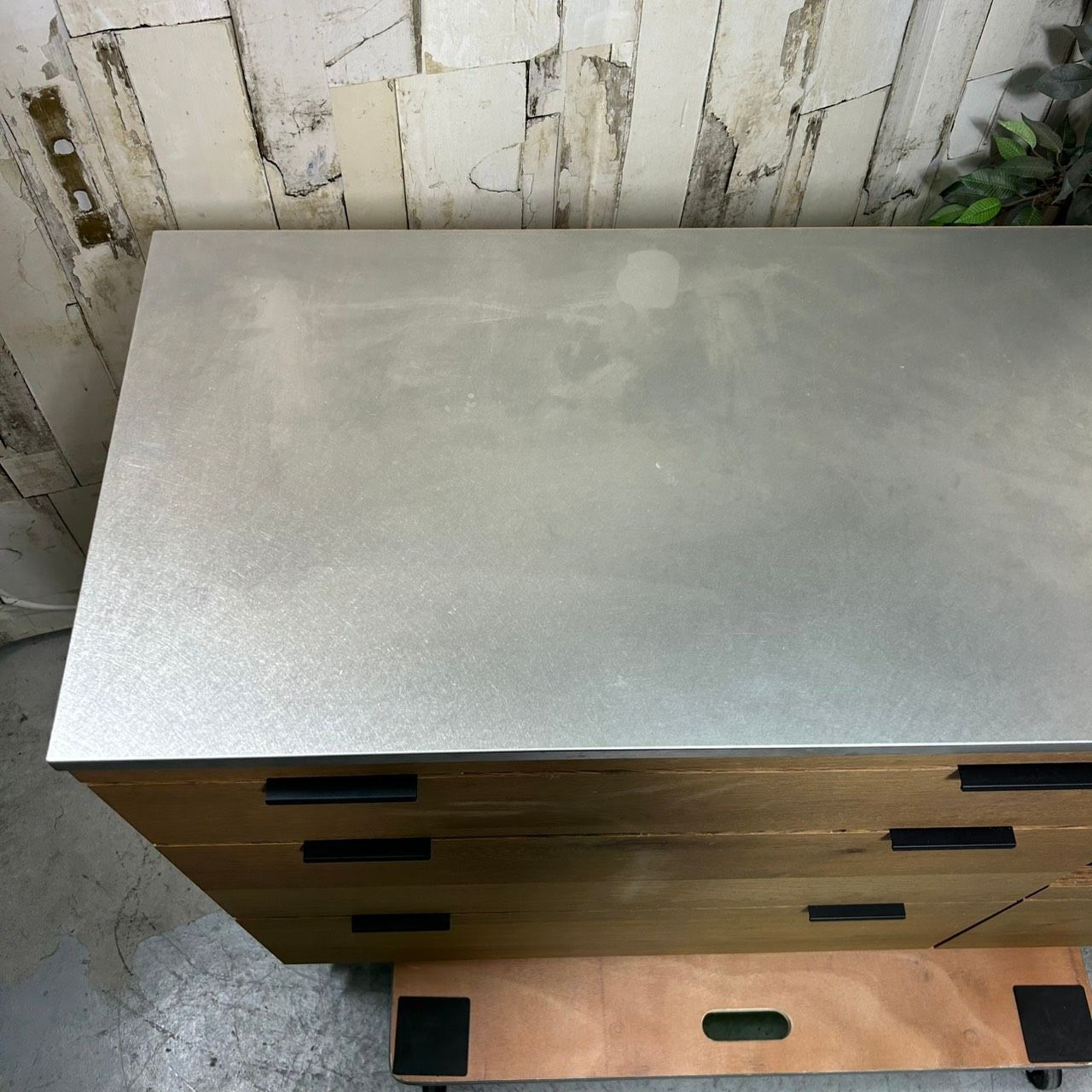 ブラックアルミの取っ手がシャープな印象を与えるアクセントに。傷が目立ちにくいステンレスの天板は耐久性が高く、日々のお手入れに便利です。引き出しには、調理器具やこまごました物をたっぷりしまって。コンセント付きの便利なスライド棚には、家電をすっきり収納できます。