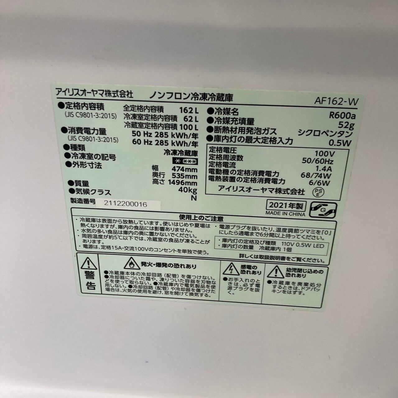 26063 2ドア冷凍冷蔵庫 アイリスオーヤマ AF162-W 2021年製 162L