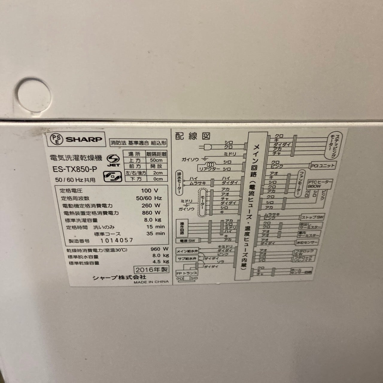 26076 大容量洗濯機 穴なし槽 SHARP ES-TX850-P 2016年製 洗濯 8.0kg / 乾燥 4.5kg