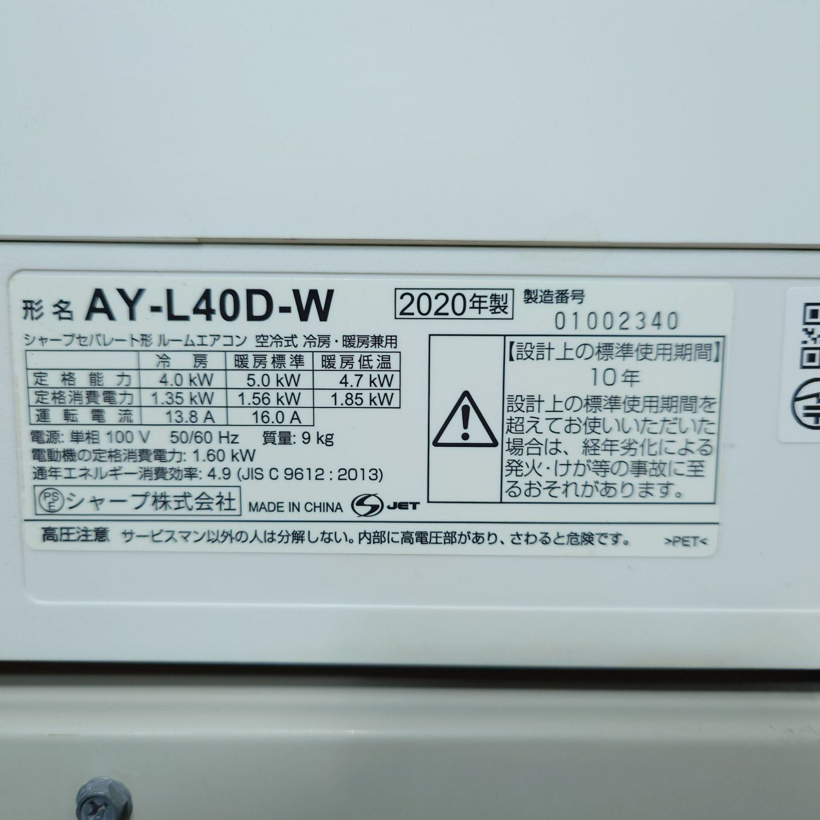 D 26081【2020年製】SHARP シャープ エアコン 冷房・暖房兼用 家電 AY-L40D-W AU-L40DY