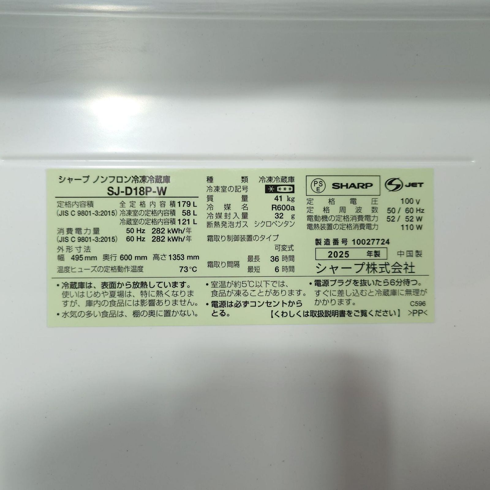 D 26170【2025年製】 極美品 SHARP シャープ 冷凍冷蔵庫 SJ-D18P-W 179L